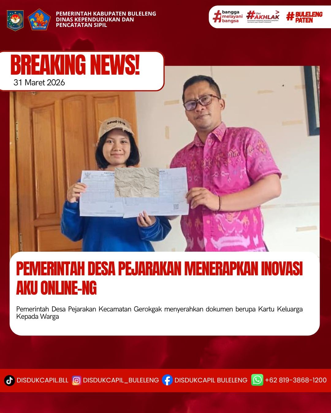 Pemerintah Kabupaten Buleleng melalui Dinas Kependudukan dan Pecatatan Sipil (Disdukcapil) Kabupaten Buleleng memaksimalkan serta mempermudah pelayanan kependudukan masyarakat dengan beberapa inovasi, melalui aplikasi AKU Online-NG. Dimana dalam penerapan aplikasi Aku Online-NG tersebut masyarakat tidak perlu lagi datang ke Dinas Dukcapil untuk melakukan pelayanan langsung, cukup dengan datang ke Desa nanti akan dibantu oleh operator Desa masing-masing. Di Desa Pejarakan Kecamatan Gerokgak, telah diserahkan dokumen kependudukan berupa Kartu Keluarga atas nama Kadek Suardika Yasa dan Kadek Lina Septi Lestari yang diserahkan langsung oleh Pemerintahan Desa Pejarakan bertempat di Kantor Perbekel Desa Pejarakan, Kecamatan Gerokgak, Kabupaten Buleleng, Selasa (31/3).