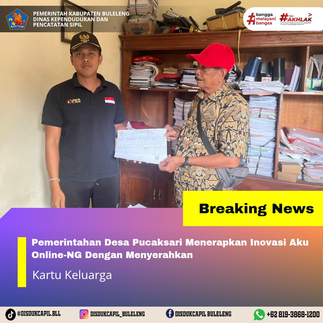 Pemerintah Kabupaten Buleleng melalui Dinas Kependudukan dan Pecatatan Sipil (Disdukcapil) Kabupaten Buleleng memaksimalkan serta mempermudah pelayanan kependudukan masyarakat dengan beberapa inovasi, melalui aplikasi AKU Online-NG. Dimana dalam penerapan aplikasi Aku Online-NG tersebut masyarakat tidak perlu lagi datang ke Dinas Dukcapil untuk melakukan pelayanan langsung cukup dengan datang ke Desa nanti akan dibantu oleh operator Desa masing-masing. Di Desa Pucaksari Kecamatan Busungbiu, telah diserahkan dokumen kependudukan berupa Kartu Keluarga atas nama I Ketut Sukarata yang diserahkan secara langsung oleh Pemerintah Desa Pucaksari, Selasa (30/12).