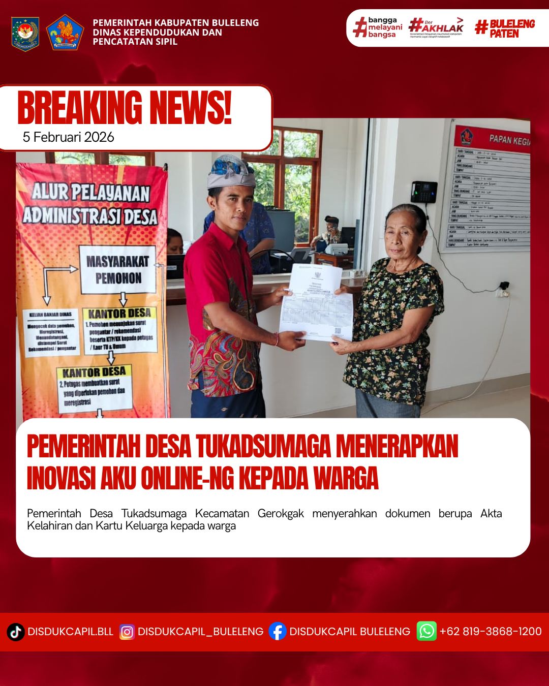 Pemerintah Kabupaten Buleleng melalui Dinas Kependudukan dan Pecatatan Sipil (Disdukcapil) Kabupaten Buleleng memaksimalkan serta mempermudah pelayanan kependudukan masyarakat dengan beberapa inovasi, melalui aplikasi AKU Online-NG. Dimana dalam penerapan aplikasi Aku Online-NG tersebut masyarakat tidak perlu lagi datang ke Dinas Dukcapil untuk melakukan pelayanan langsung cukup dengan datang ke Desa nanti akan dibantu oleh operator Desa masing-masing. Di Desa Tukadsumaga Kecamatan Gerokgak, telah diserahkan dokumen kependudukan berupa Akta Kelahiran dan Kartu Keluarga atas nama I Wayan Sulandra warga Desa Tukadsumaga yang diserahkan oleh Kelian Banjar Dinas Gandongan Ketut Wira Sena di Desa Tukadsumaga, Kamis (5/2).