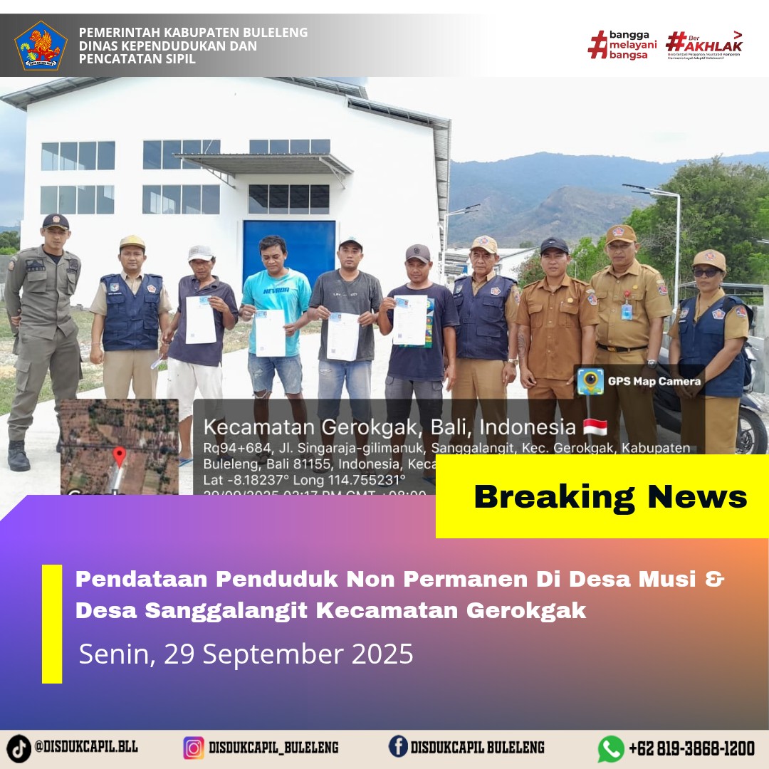 Kali ini Senin, 29 September 2025, Dinas Kependudukan dan Pencatatan Sipil Kabupaten Buleleng melaksanakan kegiatan pendataan penduduk Non Permanen di Desa Musi dan Desa Sanggalangit Kecamatan Gerokgak. Dari pendataan penduduk kali ini didapatkan hasil :