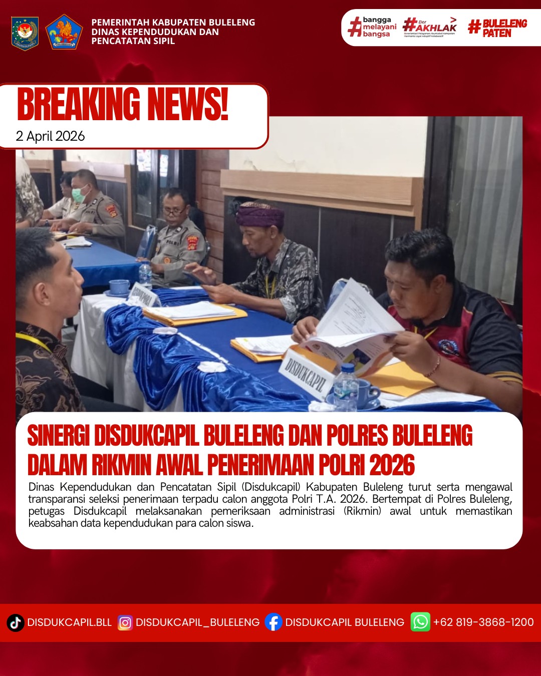 Buleleng, 2 April 2026 – Dinas Kependudukan dan Pencatatan Sipil (Disdukcapil) Kabupaten Buleleng turut serta mengawal transparansi seleksi penerimaan terpadu calon anggota Polri T.A. 2026. Bertempat di Polres Buleleng, petugas Disdukcapil melaksanakan pemeriksaan administrasi (Rikmin) awal untuk memastikan keabsahan data kependudukan para calon siswa.