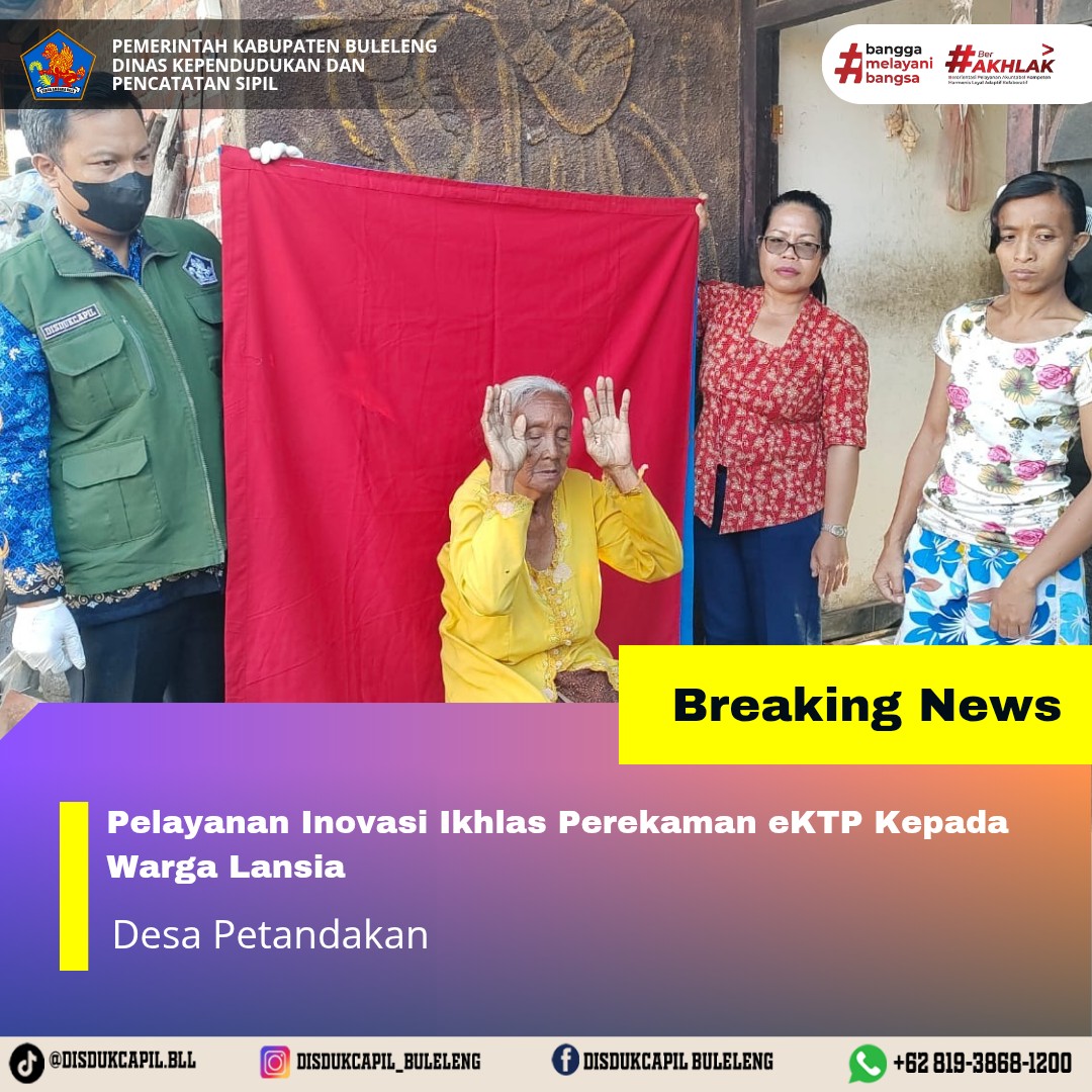 Dinas Kependudukan dan Pencatatan Sipil Kabupaten Buleleng terus berupaya memberikan pelayanan maksimal pada masyarakat dalam rangka meningkatkan kesadaran kepada masyarakat akan pentingnya memiliki dokumen kependudukan salah satunya Kartu Tanda Penduduk (KTP). Berbagai macam inovasi dikembangkan untuk mempermudah masyarakat dapat memiliki dokumen kependudukan. Salah satu Inovasi yang diberikan kepada masyarakat adalah Inovasi "IKHLAS" (Tim Khusus Layanan Untuk Orang Sakit dan Disabilitas) yaitu jembut bola perekaman KTP-el ke rumah warga yang tidak bisa datang langsung ke Kantor Disdukcapil untuk melakukan perekaman eKTP. Sesuai dengan Undang-Undang Republik Indonesia Nomor 24 Tahun 2013 tentang Administrasi Kependudukan, menyatakan bahwa Penduduk Warga Negara Indonesia dan Orang Asing yang memiliki Izin Tinggal Tetap yang telah berumur 17 (tujuh belas) tahun atau telah kawin atau pernah kawin wajib memiliki KTP-el. Namun demikian, ada beberapa penduduk yang tidak bisa datang langsung ke Kantor Dinas Kependudukan dan Pencatatan Sipil Kabupaten Buleleng karena kendala kesehatan dan usia lanjut.