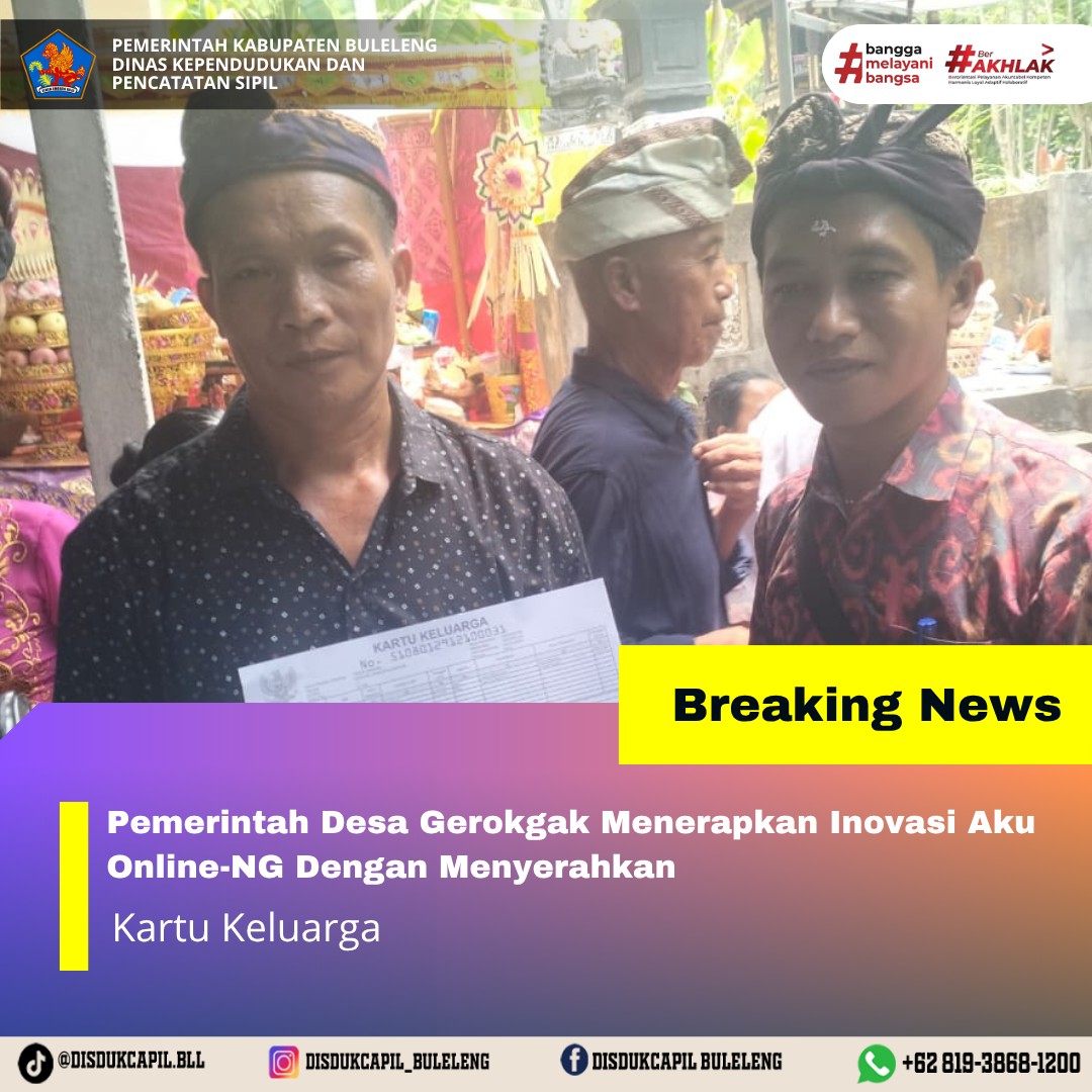 Pemerintah Kabupaten Buleleng melalui Dinas Kependudukan dan Pecatatan Sipil (Disdukcapil) Kabupaten Buleleng memaksimalkan serta mempermudah pelayanan kependudukan masyarakat dengan beberapa inovasi, melalui aplikasi AKU Online-NG. Dimana dalam penerapan aplikasi Aku Online-NG tersebut masyarakat tidak perlu lagi datang ke Dinas Dukcapil untuk melakukan pelayanan langsung cukup dengan datang ke Desa nanti akan dibantu oleh operator Desa masing-masing. Di Desa Gerokgak Kecamatan Gerokgak, telah diserahkan dokumen kependudukan berupa Kartu Keluarga atas nama Made Dangin dan Komang Sujana yang diserahkan secara langsung oleh Kelian Banjar Dinas Pucaksari Desa Gerokgak Kecamatan Gerokgak, Jumat (17/10).