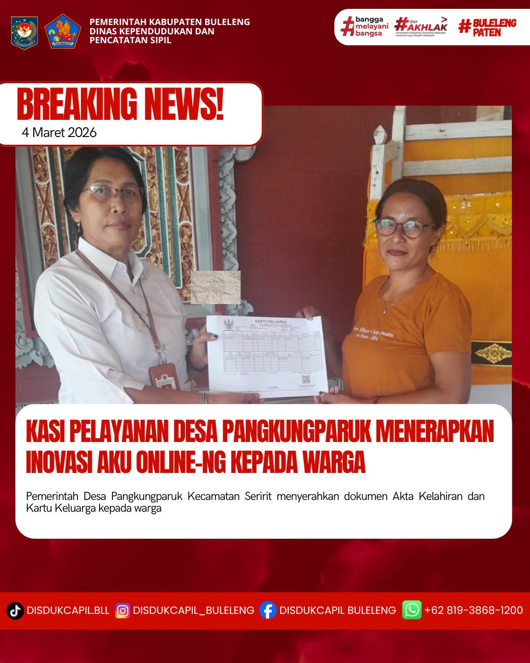 Pemerintah Kabupaten Buleleng melalui Dinas Kependudukan dan Pecatatan Sipil (Disdukcapil) Kabupaten Buleleng memaksimalkan serta mempermudah pelayanan kependudukan masyarakat dengan beberapa inovasi, melalui aplikasi AKU Online-NG. Dimana dalam penerapan aplikasi Aku Online-NG tersebut masyarakat tidak perlu lagi datang ke Dinas Dukcapil untuk melakukan pelayanan langsung cukup dengan datang ke Desa nanti akan dibantu oleh operator Desa masing-masing. Di Desa Pangkungparuk Kecamatan Seririt, telah diserahkan dokumen kependudukan berupa Akta Kelahiran dan Kartu Keluarga atas nama Wayan Sumiada warga Banjar Dinas Pangkungparuk Desa Pangkungparuk yang diserahkan oleh Kasi Pelayanan Desa Pangkungparuk, Rabu (4/3).