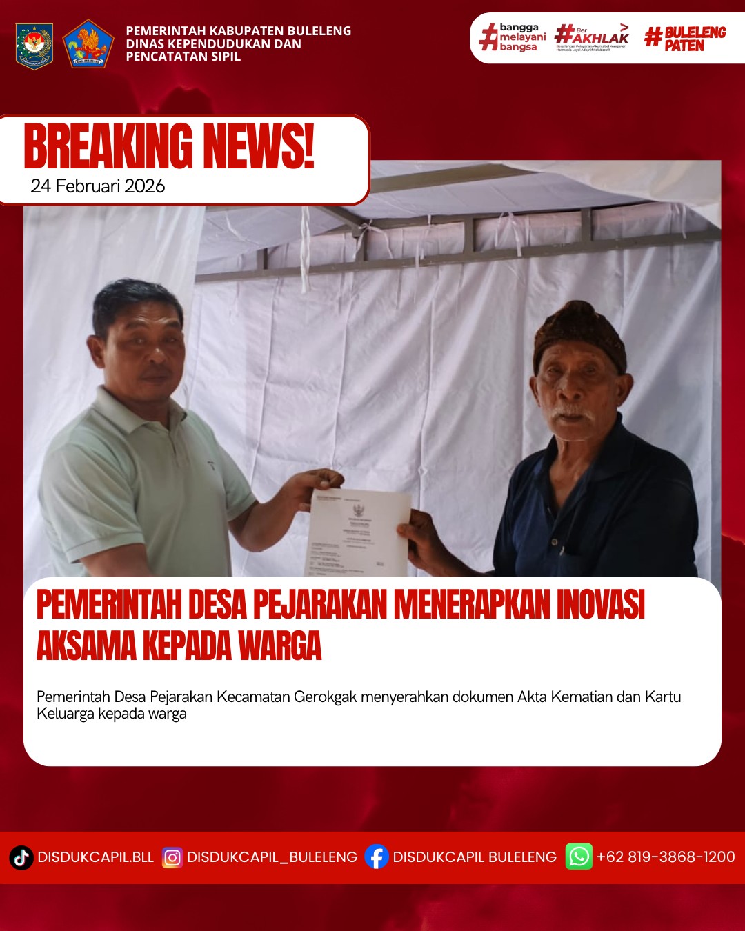 Pemerintah Kabupaten Buleleng melalui Dinas Kependudukan dan Pecatatan Sipil (Disdukcapil) Kabupaten Buleleng memaksimalkan serta mempermudah pelayanan kependudukan masyarakat dengan beberapa inovasi, yakni BALITA (Bayi Lahir Berakta), NYAKSI (Menyerahkan Akta Kawin Saat Acara Perkawinan) dan AKSAMA ( Akta Kematian Diserahkan Saat Masih Berduka) melalui aplikasi Aku Online-NG. Di Desa Pejarakan Kecamatan Gerokgak, telah diterapkan program Aksama (Akta Kematian Diserahkan Saat Masih Berduka) yang dilakukan secara langsung oleh Kelian Banjar Dinas Goris Pasar Desa Pejarakan dengan menyerahkan Akta Kematian atas nama KETUT MERTA YASA dan Kartu Keluarga atas nama KETUT SELAMET kepada keluarga almarhum di Banjar Dinas Goris Pasar, Desa Pejarakan, Kecamatan Gerokgak, Selasa (24/2).
