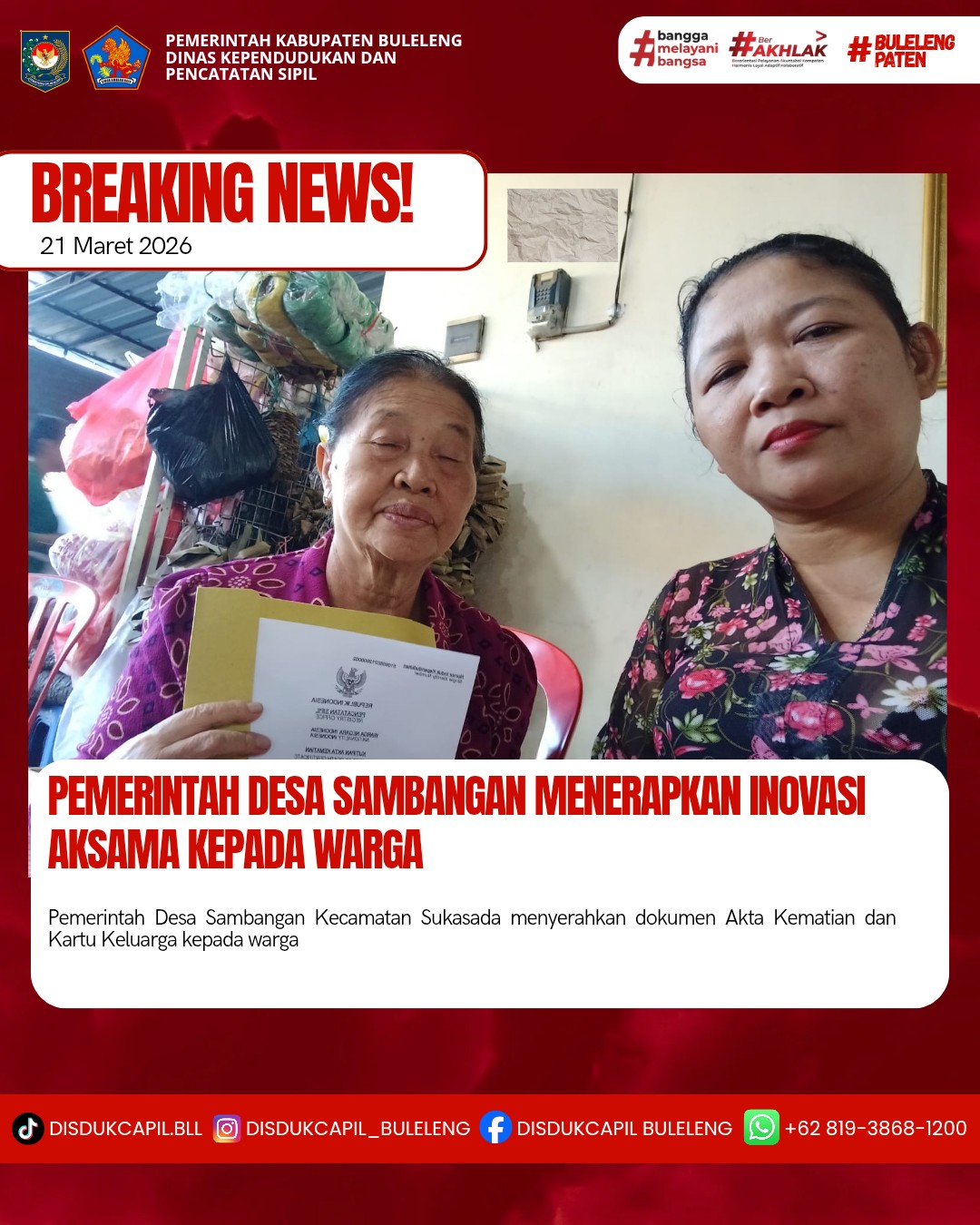 Pemerintah Kabupaten Buleleng melalui Dinas Kependudukan dan Pecatatan Sipil (Disdukcapil) Kabupaten Buleleng memaksimalkan serta mempermudah pelayanan kependudukan masyarakat dengan beberapa inovasi, yakni BALITA (Bayi Lahir Berakta), NYAKSI (Menyerahkan Akta Kawin Saat Acara Perkawinan) dan AKSAMA (Akta Kematian Diserahkan Saat Masih Berduka) melalui aplikasi Aku Online. Di Desa Sambangan Kecamatan Sukasada, telah diterapkan program Aksama (Akta Kematian Diserahkan Saat Masih Berduka) yang dilakukan secara langsung oleh Kasi Pemerintah Desa Sambangan dengan menyerahkan Akta Kematian atas nama Made Heri Muliawan dan Kartu Keluarga kepada pihak keluarga yang beralamat di rumah duka di Desa Sambangan Kecamatan Sukasada, Sabtu (21/3).