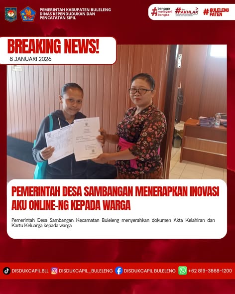 Pemerintah Kabupaten Buleleng melalui Dinas Kependudukan dan Pecatatan Sipil (Disdukcapil) Kabupaten Buleleng memaksimalkan serta mempermudah pelayanan kependudukan masyarakat dengan beberapa inovasi, melalui aplikasi AKU Online-NG. Dimana dalam penerapan aplikasi Aku Online-NG tersebut masyarakat tidak perlu lagi datang ke Dinas Dukcapil untuk melakukan pelayanan langsung cukup dengan datang ke Desa nanti akan dibantu oleh operator Desa masing-masing. Di Desa Sambangan Kecamatan Sukasada, telah diserahkan dokumen kependudukan berupa Akta Kelahiran atas nama Kadek Destiya Artasya dan Kartu Keluarga atas nama Ketut Robi Yasa diserahkan oleh Kasi Pemerintahan Desa Sambangan bertempat di Kantor Perbekel Desa Sambangan, Kecamatan Sukasada, Kabupaten Buleleng, Kamis (8/1).