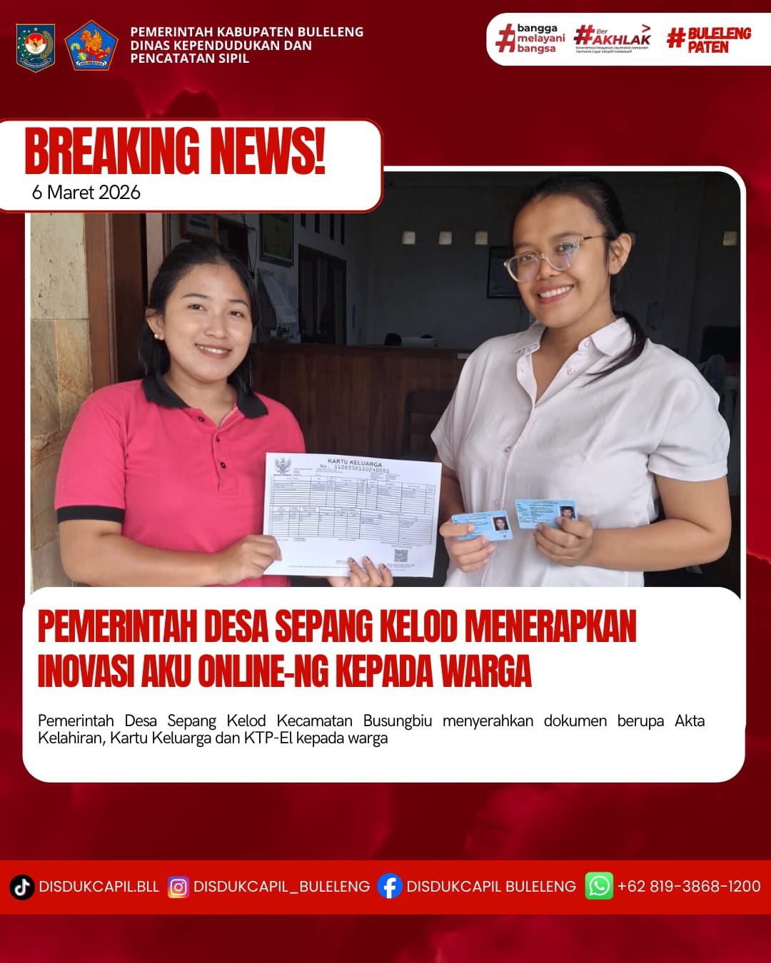 Pemerintah Kabupaten Buleleng melalui Dinas Kependudukan dan Pecatatan Sipil (Disdukcapil) Kabupaten Buleleng memaksimalkan serta mempermudah pelayanan kependudukan masyarakat dengan beberapa inovasi, melalui aplikasi AKU Online-NG. Dimana dalam penerapan aplikasi Aku Online-NG tersebut masyarakat tidak perlu lagi datang ke Dinas Dukcapil untuk melakukan pelayanan langsung cukup dengan datang ke Desa nanti akan dibantu oleh operator Desa masing-masing. Di Desa Pelapuan Kecamatan Busungbiu, telah diserahkan dokumen kependudukan berupa Akta Kelahiran, Kartu Keluarga dan KTP-El kepada warga Banjar Dinas Asah Badung Desa Sepang Kelod yang diserahkan oleh Staff Arsip bertempat di Kantor Perbekel Desa Sepang Kelod, Kecamatan Busungbiu, Kabupaten Buleleng, Jumat (6/3).