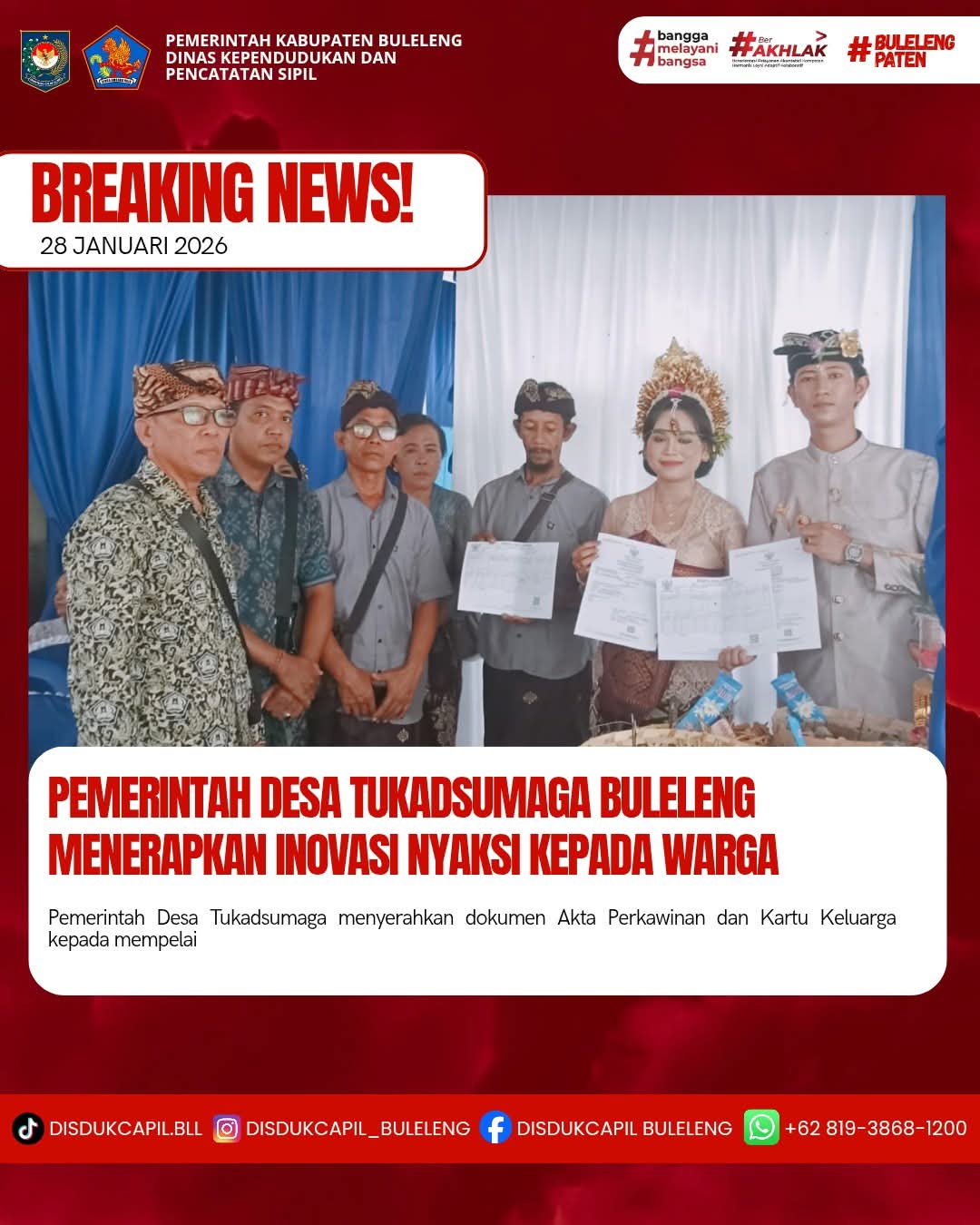 Pemerintah Kabupaten Buleleng melalui Dinas Kependudukan dan Pecatatan Sipil (Disdukcapil) Kabupaten Buleleng memaksimalkan serta mempermudah pelayanan kependudukan masyarakat dengan beberapa inovasi, yakni BALITA (Bayi Lahir Berakta), NYAKSI (Menyerahkan Akta Kawin Saat Acara Perkawinan) dan AKSAMA ( Akta Kematian Diserahkan Saat Masih Berduka) melalui aplikasi Aku Online-NG. Di Desa Tukadsumaga Kecamatan Gerokgak, telah diterapkan program NYAKSI (Menyerahkan Akta Perkawinan Saat Acara Perkawinan) yang dilakukan secara langsung oleh Kelian Banjar Dinas Yehmas dengan menyerahkan Akta Perkawinan atas nama Kadek Lion Indra Permana dengan Kadek Erni Sapitri dan Kartu Keluarga kepada kedua mempelai dan kartu keluarga masing-masing orang tua mempelai di Desa Tukadsumaga Kecamatan Gerogak, Selasa (28/1).