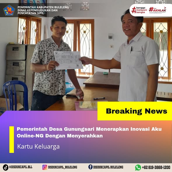 Pemerintah Kabupaten Buleleng melalui Dinas Kependudukan dan Pecatatan Sipil (Disdukcapil) Kabupaten Buleleng memaksimalkan serta mempermudah pelayanan kependudukan masyarakat dengan beberapa inovasi, melalui aplikasi AKU Online-NG. Dimana dalam penerapan aplikasi Aku Online-NG tersebut masyarakat tidak perlu lagi datang ke Dinas Dukcapil untuk melakukan pelayanan langsung cukup dengan datang ke Desa nanti akan dibantu oleh operator Desa masing-masing. Di Desa Gunungsari Kecamatan Seririt, telah diserahkan dokumen kependudukan berupa Kartu Keluarga atas nama KADEK WARSIKA yang diserahkan oleh Pemerintah Desa Gunungsari kepada warga Banjar Dinas Sekar Desa Gunungsari, bertempat di Kantor Perbekel Desa Gunungsari, Kecamatan Seririt, Kabupaten Buleleng, Rabu (10/12).