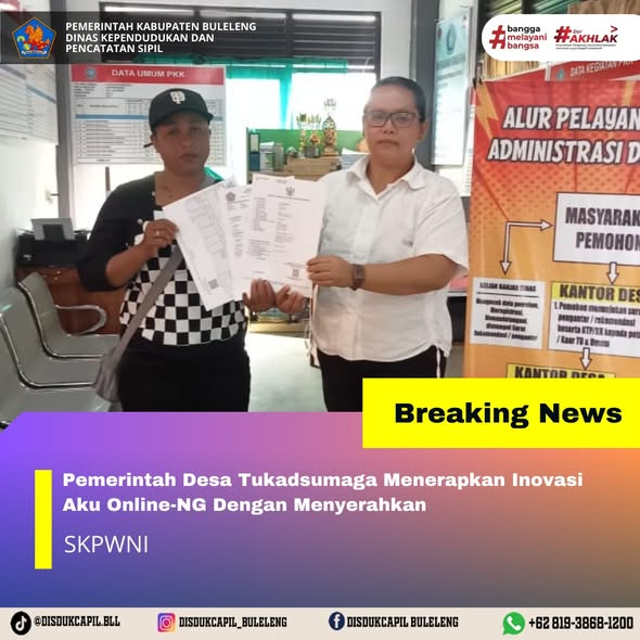 Pemerintah Kabupaten Buleleng melalui Dinas Kependudukan dan Pecatatan Sipil (Disdukcapil) Kabupaten Buleleng memaksimalkan serta mempermudah pelayanan kependudukan masyarakat dengan beberapa inovasi, melalui aplikasi AKU Online-NG. Dimana dalam penerapan aplikasi Aku Online-NG tersebut masyarakat tidak perlu lagi datang ke Dinas Dukcapil untuk melakukan pelayanan langsung cukup dengan datang ke Desa nanti akan dibantu oleh operator Desa masing-masing. Di Desa Tukadsumaga Kecamatan Gerokgak, telah diserahkan dokumen kependudukan berupa SKPWNI atas nama Ni Luh Sri Antini warga alamat asal Banjar Dinas Buluh,Desa Tukadsumaga yang diserahkan oleh Kasi Pemerintahan, Rabu (10/12).
