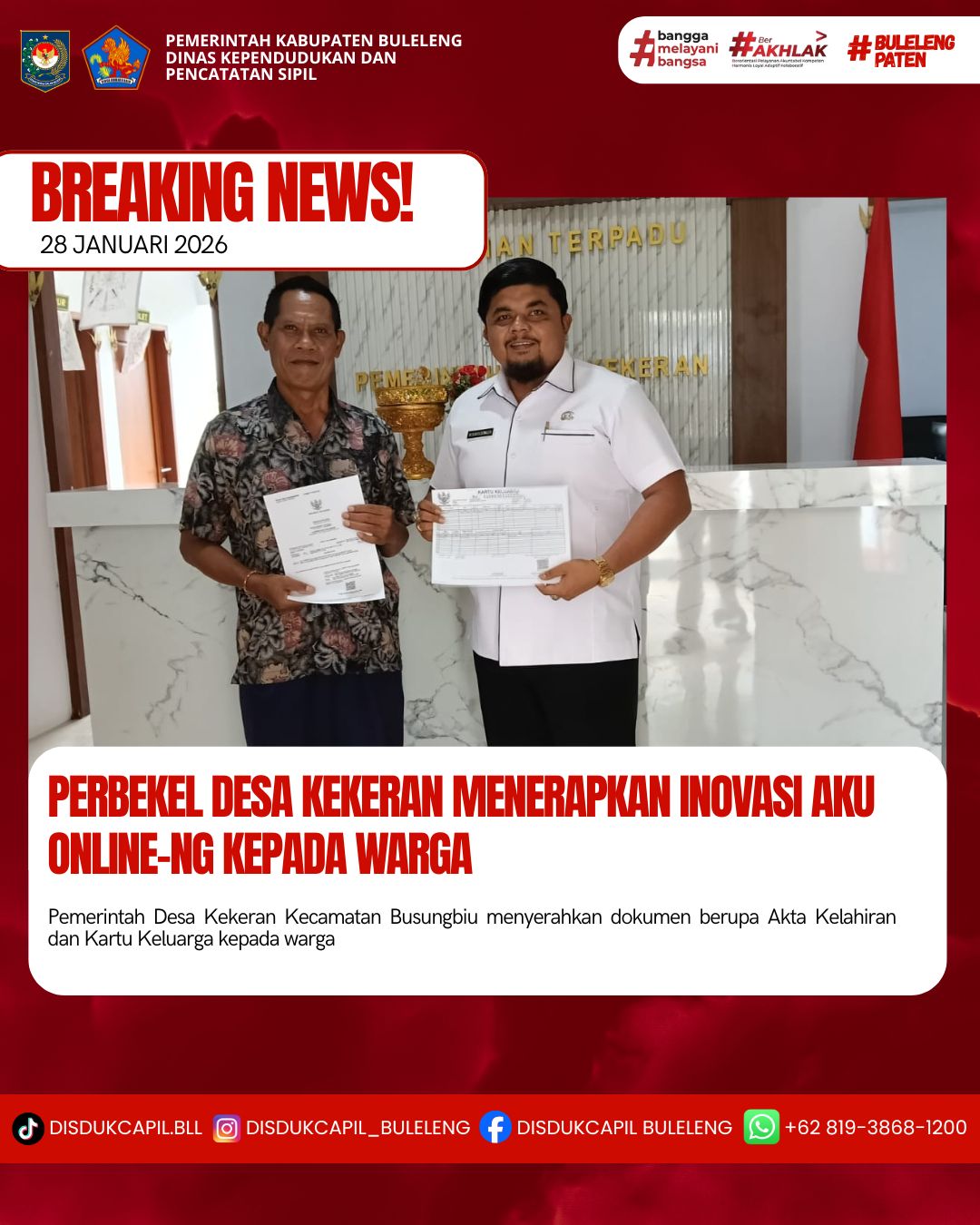 Pemerintah Kabupaten Buleleng melalui Dinas Kependudukan dan Pecatatan Sipil (Disdukcapil) Kabupaten Buleleng memaksimalkan serta mempermudah pelayanan kependudukan masyarakat dengan beberapa inovasi, melalui aplikasi AKU Online-NG. Dimana dalam penerapan aplikasi Aku Online-NG tersebut masyarakat tidak perlu lagi datang ke Dinas Dukcapil untuk melakukan pelayanan langsung cukup dengan datang ke Desa nanti akan dibantu oleh operator Desa masing-masing. Di Desa Kekeran Kecamatan Busungbiu, telah diserahkan dokumen kependudukan berupa Akta Kelahiran dan Kartu Keluarga atas nama Wayan Suwini yang diserahkan oleh Bapak Perbekel Desa Dekeran Komang Eva Wahyu Diatmika kepada warga bertempat di Kantor Perbekel Desa kekeran, Kecamatan Busungbiu, Kabupaten Buleleng, Rabu (28/1).