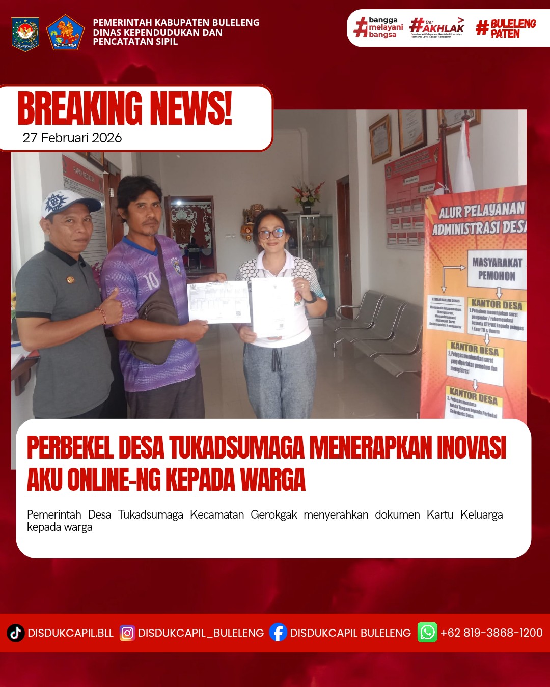 Pemerintah Kabupaten Buleleng melalui Dinas Kependudukan dan Pecatatan Sipil (Disdukcapil) Kabupaten Buleleng memaksimalkan serta mempermudah pelayanan kependudukan masyarakat dengan beberapa inovasi, melalui aplikasi AKU Online-NG. Dimana dalam penerapan aplikasi Aku Online-NG tersebut masyarakat tidak perlu lagi datang ke Dinas Dukcapil untuk melakukan pelayanan langsung cukup dengan datang ke Desa nanti akan dibantu oleh operator Desa masing-masing. Di Desa Tukadsumaga Kecamatan Gerokgak, telah diserahkan dokumen kependudukan berupa Kartu Keluarga atas nama NYOMAN SUTARMA yang diserahkan oleh Perbekel Desa Tukadsumaga Anak Agung Sri Wathi didampingi oleh Kasi Pemerintahan di Desa Tukadsumaga, Jumat (27/2).