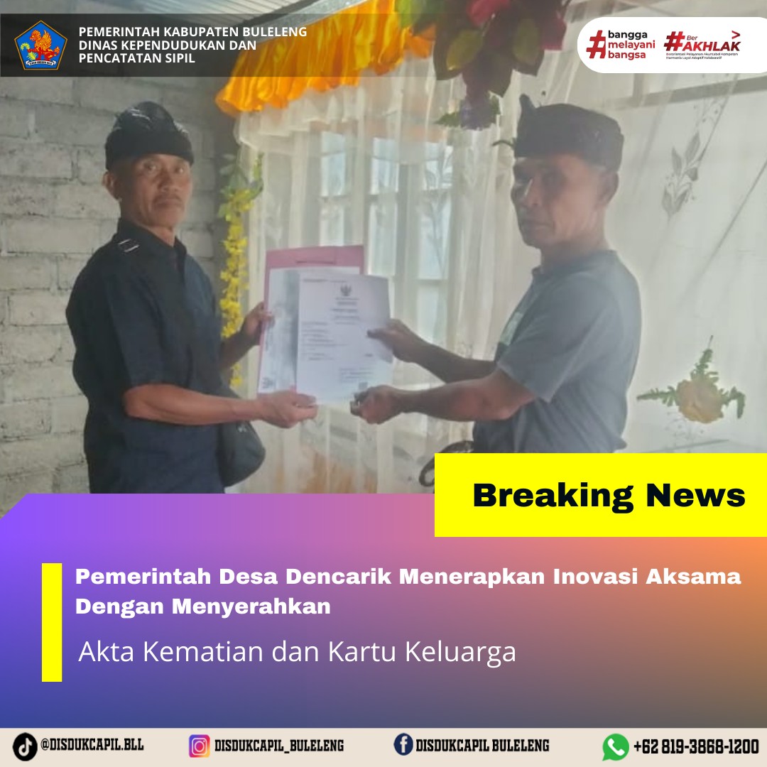Pemerintah Kabupaten Buleleng melalui Dinas Kependudukan dan Pecatatan Sipil (Disdukcapil) Kabupaten Buleleng memaksimalkan serta mempermudah pelayanan kependudukan masyarakat dengan beberapa inovasi, yakni BALITA (Bayi Lahir Berakta), NYAKSI (Menyerahkan Akta Kawin Saat Acara Perkawinan) dan AKSAMA ( Akta Kematian Diserahkan Saat Masih Berduka) melalui aplikasi Aku Online-NG. Di Desa Dencarik Kecamatan Banjar, telah diterapkan program Aksama (Akta Kematian Diserahkan Saat Masih Berduka) yang dilakukan secara langsung oleh Pemerintah Desa Dencarik dengan menyerahkan Akta Kematian dan Kartu Keluarga atas nama Nengah Sini kepada keluarga almarhum di Rumah Duka di Desa Dencarik Kecamatan Banjar, Jumat (19/12).