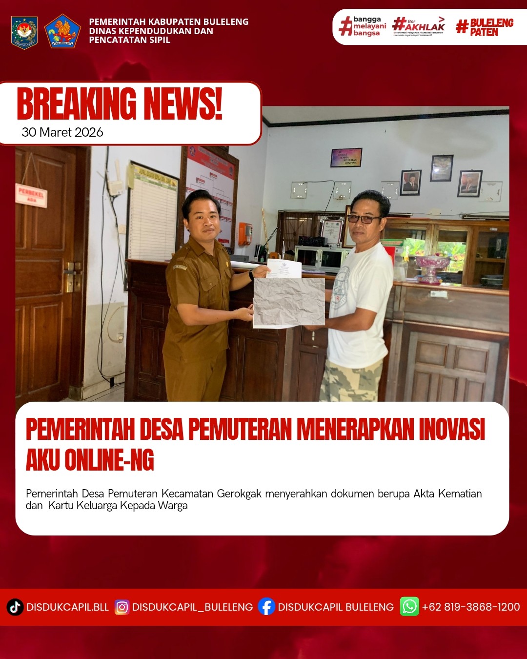 Pemerintah Kabupaten Buleleng melalui Dinas Kependudukan dan Pecatatan Sipil (Disdukcapil) Kabupaten Buleleng memaksimalkan serta mempermudah pelayanan kependudukan masyarakat dengan beberapa inovasi, melalui aplikasi AKU Online-NG. Dimana dalam penerapan aplikasi Aku Online-NG tersebut masyarakat tidak perlu lagi datang ke Dinas Dukcapil untuk melakukan pelayanan langsung cukup dengan datang ke Desa nanti akan dibantu oleh operator Desa masing-masing. Di Desa Pemuteran Kecamatan Gerokgak, telah diserahkan dokumen kependudukan berupa Akta Kematian dan Kartu Keluarga kepada Masyarakat atas nama Wayan Swardana yang diserahkan langsung oleh Kasi Pemerintahan Desa Pemuteran, Senin (30/3).