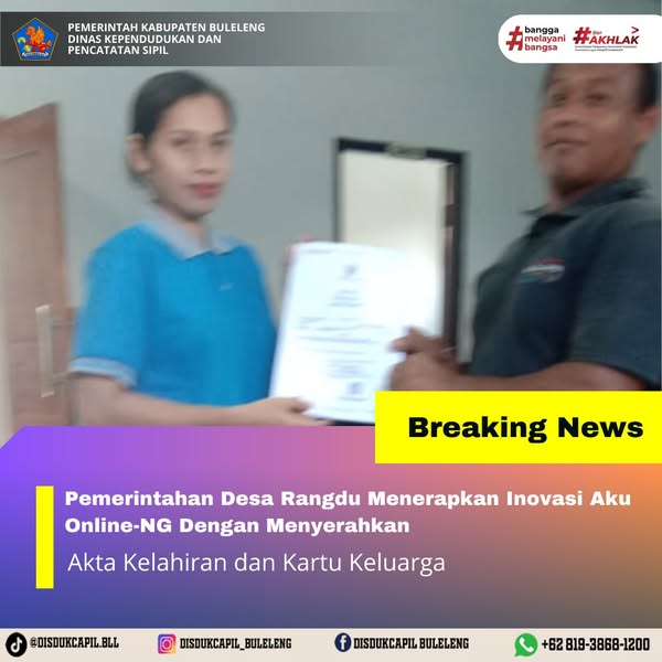 Pemerintah Kabupaten Buleleng melalui Dinas Kependudukan dan Pecatatan Sipil (Disdukcapil) Kabupaten Buleleng memaksimalkan serta mempermudah pelayanan kependudukan masyarakat dengan beberapa inovasi, melalui aplikasi AKU Online-NG. Dimana dalam penerapan aplikasi Aku Online-NG tersebut masyarakat tidak perlu lagi datang ke Dinas Dukcapil untuk melakukan pelayanan langsung cukup dengan datang ke Desa nanti akan dibantu oleh operator Desa masing-masing. Di Desa Rangdu Kecamatan Seririt, telah diserahkan dokumen kependudukan berupa Akta Kelahiran dan Kartu Keluarga atas nama Ketut Asrini yang diserahkan langsung oleh Operator Desa Rangdu Kecamatan Seririt, Rabu (13/8).