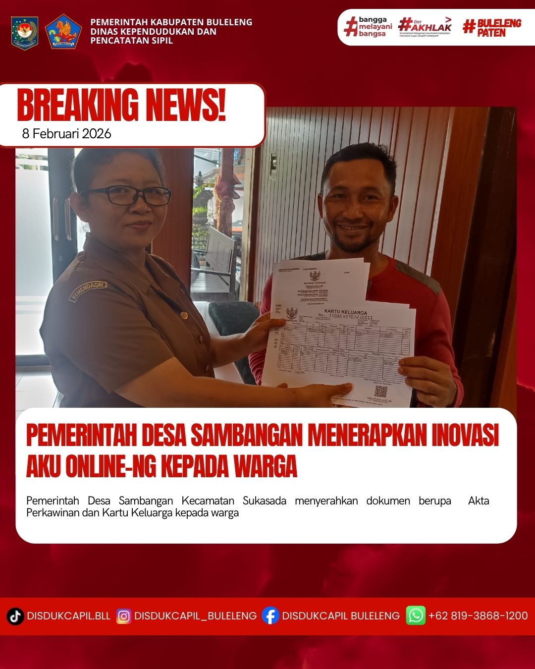Pemerintah Kabupaten Buleleng melalui Dinas Kependudukan dan Pecatatan Sipil (Disdukcapil) Kabupaten Buleleng memaksimalkan serta mempermudah pelayanan kependudukan masyarakat dengan beberapa inovasi, melalui aplikasi AKU Online-NG. Dimana dalam penerapan aplikasi Aku Online-NG tersebut masyarakat tidak perlu lagi datang ke Dinas Dukcapil untuk melakukan pelayanan langsung cukup dengan datang ke Desa nanti akan dibantu oleh operator Desa masing-masing. Di Desa Sambangan Kecamatan Sukasada, telah diserahkan dokumen kependudukan berupa Akta Perkawinan dan Kartu Keluarga atas nama I Kadek Ari Suprapta diserahkan oleh Kasi Pemerintahan Desa Sambangan bertempat di Kantor Perbekel Desa Sambangan, Kecamatan Sukasada, Kabupaten Buleleng, Senin (9/2).