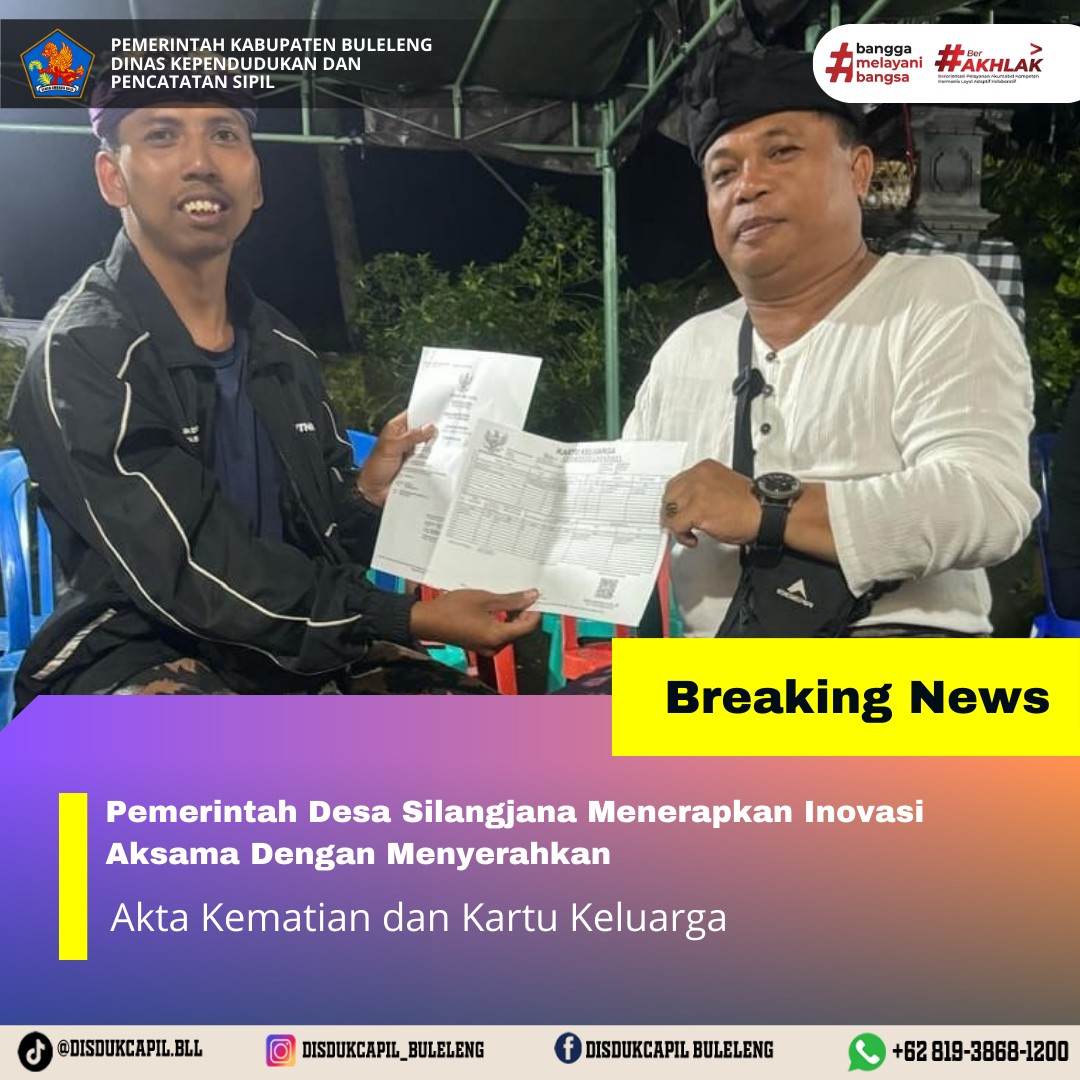 Pemerintah Kabupaten Buleleng melalui Dinas Kependudukan dan Pecatatan Sipil (Disdukcapil) Kabupaten Buleleng memaksimalkan serta mempermudah pelayanan kependudukan masyarakat dengan beberapa inovasi, yakni BALITA (Bayi Lahir Berakta), NYAKSI (Menyerahkan Akta Kawin Saat Acara Perkawinan) dan AKSAMA ( Akta Kematian Diserahkan Saat Masih Berduka) melalui aplikasi Aku Online-NG. Di Desa Silangjana Kecamatan Sukasada, telah diterapkan program Aksama (Akta Kematian Diserahkan Saat Masih Berduka) yang dilakukan secara langsung oleh Kasi Pemerintahan Desa Silangjana dengan menyerahkan Akta Kematian atas nama Nyoman Susila dan Kartu Keluarga atas nama Made Sujati kepada pihak keluarga di rumah duka di Desa Silangjana, Sabtu (6/12).