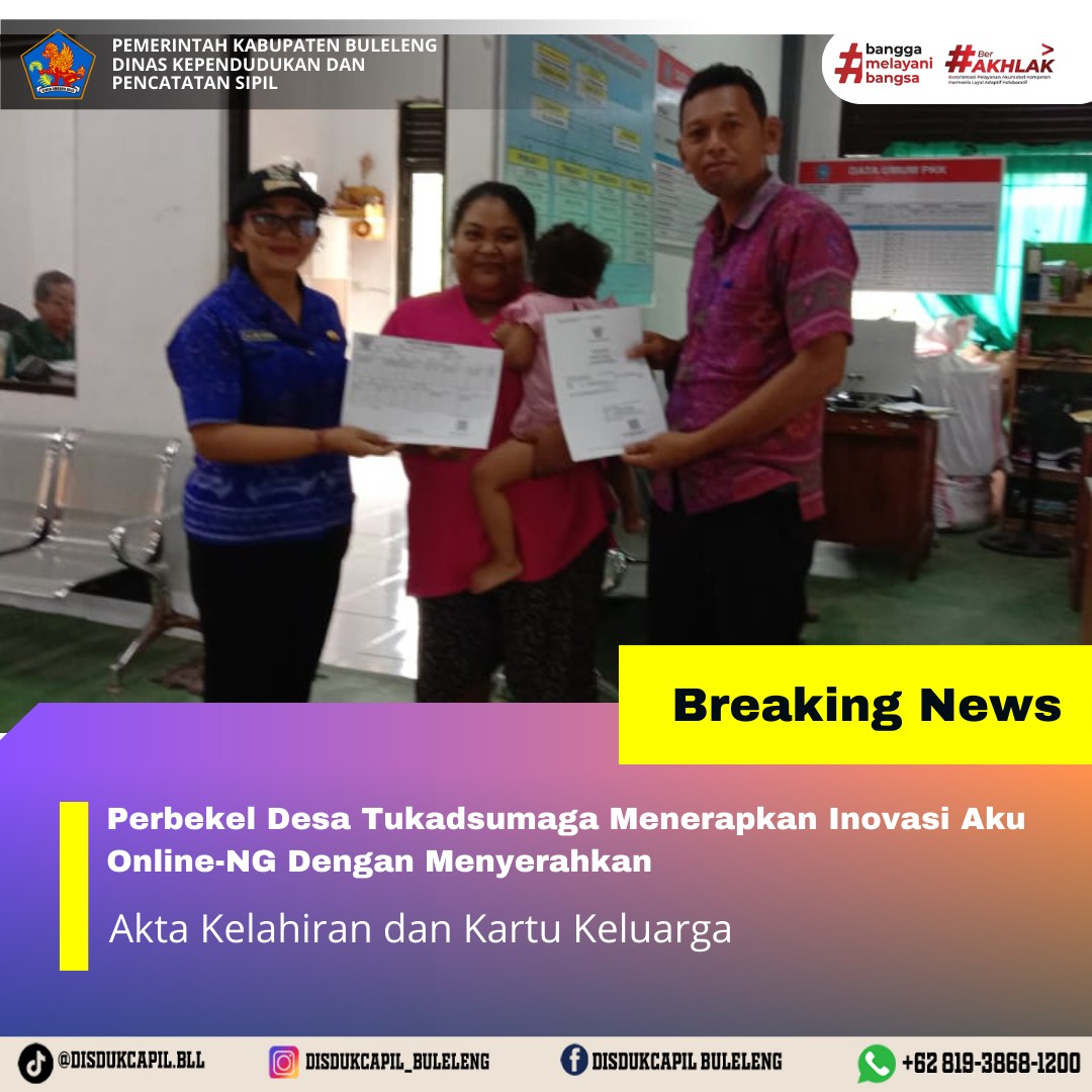 Pemerintah Kabupaten Buleleng melalui Dinas Kependudukan dan Pecatatan Sipil (Disdukcapil) Kabupaten Buleleng memaksimalkan serta mempermudah pelayanan kependudukan masyarakat dengan beberapa inovasi, melalui aplikasi AKU Online-NG. Dimana dalam penerapan aplikasi Aku Online-NG tersebut masyarakat tidak perlu lagi datang ke Dinas Dukcapil untuk melakukan pelayanan langsung cukup dengan datang ke Desa nanti akan dibantu oleh operator Desa masing-masing. Di Desa Tukadsumaga Kecamatan Gerokgak, telah diserahkan dokumen kependudukan berupa Akta Kelahiran dan Kartu Keluarga atas nama I Putu Pancapariama warga Banjar Dinas Gandongan Cendana yang diserahkan oleh Perbekel Desa Tukadsumaga Anak Agung Sri Wathi di Kantor Desa Tukadsumaga, Selasa (16/12).