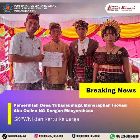 Pemerintah Kabupaten Buleleng melalui Dinas Kependudukan dan Pecatatan Sipil (Disdukcapil) Kabupaten Buleleng memaksimalkan serta mempermudah pelayanan kependudukan masyarakat dengan beberapa inovasi, melalui aplikasi AKU Online-NG. Dimana dalam penerapan aplikasi Aku Online-NG tersebut masyarakat tidak perlu lagi datang ke Dinas Dukcapil untuk melakukan pelayanan langsung cukup dengan datang ke Desa nanti akan dibantu oleh operator Desa masing-masing. Di Desa Tukadsumaga Kecamatan Gerokgak, telah diserahkan dokumen kependudukan berupa SKPWNI atas nama Ni Ketut Rosita Dewi dan Kartu Keluarga atas nama I Putu Suweta yang diserahkan oleh Perbekel Desa Tukadsumaga Anak Agung Sri Wathi kepada warga Banjar Dinas Buluh Desa Tukadsumaga, Rabu (29/10).
