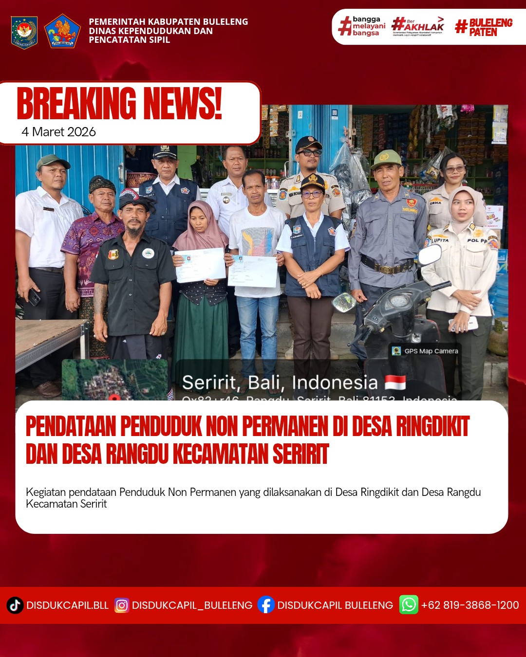 Kali ini Rabu, 4 Maret 2026, Dinas Kependudukan dan Pencatatan Sipil Kabupaten Buleleng melaksanakan kegiatan pendataan penduduk Non Permanen di Desa Ringdikit dan Desa Rangdu Kecamatan Seririt. Dari pendataan penduduk kali ini didapatkan hasil :