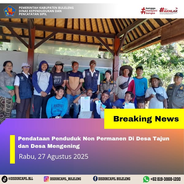 Kali ini Rabu, 27 Agustus 2025, Dinas Kependudukan dan Pencatatan Sipil Kabupaten Buleleng melaksanakan kegiatan pendataan penduduk Non Permanen di Desa Tajun dan Desa Mengening Kecamatan Kubutambahan. Dari pendataan penduduk kali ini didapatkan hasil :
