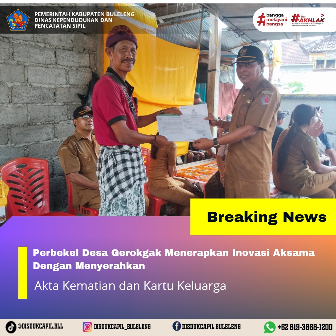Pemerintah Kabupaten Buleleng melalui Dinas Kependudukan dan Pecatatan Sipil (Disdukcapil) Kabupaten Buleleng memaksimalkan serta mempermudah pelayanan kependudukan masyarakat dengan beberapa inovasi, yakni BALITA (Bayi Lahir Berakta), NYAKSI (Menyerahkan Akta Kawin Saat Acara Perkawinan) dan AKSAMA ( Akta Kematian Diserahkan Saat Masih Berduka) melalui aplikasi Aku Online-NG. Di Desa Gerokgak Kecamatan Gerokgak, telah diterapkan program Aksama (Akta Kematian Diserahkan Saat Masih Berduka) yang dilakukan secara langsung oleh Perbekel Desa Gerokgak I Nyoman Wijaya dengan menyerahkan Akta Kematian atas nama Gustii Made Putra L. dan Kartu Keluarga atas nama Gusti Ayu Sasih kepada keluarga almarhum di rumah duka Banjar Dinas Gerokgak, Desa Gerokgak, Jumat (2/1).