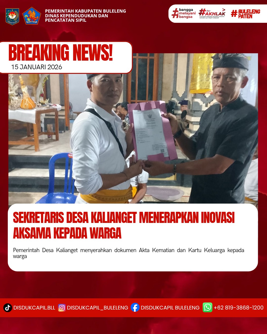 Pemerintah Kabupaten Buleleng melalui Dinas Kependudukan dan Pecatatan Sipil (Disdukcapil) Kabupaten Buleleng memaksimalkan serta mempermudah pelayanan kependudukan masyarakat dengan beberapa inovasi, yakni BALITA (Bayi Lahir Berakta), NYAKSI (Menyerahkan Akta Kawin Saat Acara Perkawinan) dan AKSAMA ( Akta Kematian Diserahkan Saat Masih Berduka) melalui aplikasi Aku Online-NG. Di Desa Kalianget Kecamatan Seririt, telah diterapkan program Aksama (Akta Kematian Diserahkan Saat Masih Berduka) yang dilakukan secara langsung oleh Perbekel Desa Kalianget Ketut Nanda Kusuma dengan menyerahkan Akta Kematian dan Kartu Keluarga warga Dusun Alas Harum Desa Kalianget, Kamis (15/1).