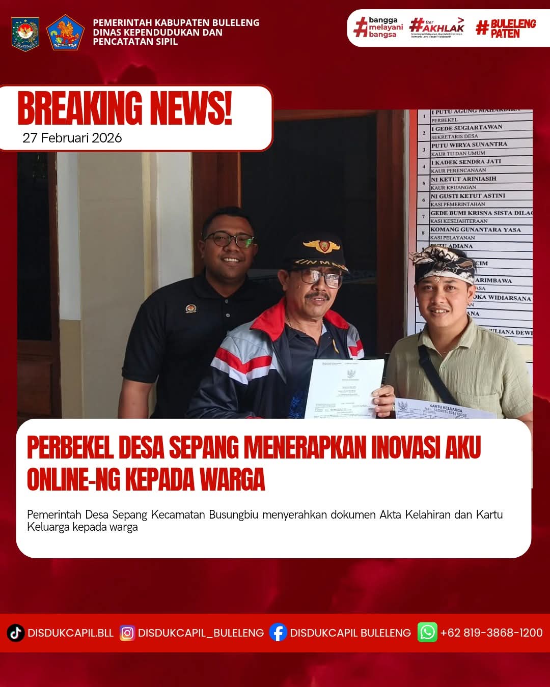 Pemerintah Kabupaten Buleleng melalui Dinas Kependudukan dan Pecatatan Sipil (Disdukcapil) Kabupaten Buleleng memaksimalkan serta mempermudah pelayanan kependudukan masyarakat dengan beberapa inovasi, melalui aplikasi AKU Online-NG. Dimana dalam penerapan aplikasi Aku Online-NG tersebut masyarakat tidak perlu lagi datang ke Dinas Dukcapil untuk melakukan pelayanan langsung cukup dengan datang ke Desa nanti akan dibantu oleh operator Desa masing-masing. Di Desa Sepang Kecamatan Busungbiu, telah diserahkan dokumen kependudukan berupa Akta Kelahiran dan Kartu Keluarga kepada warga atas nama Kadek Agus Renaldi yang diserahkan secara langsung oleh Perbekel Sepang I Putu Agung Mahardika dan didampingi Operator Desa I Gede Juliana, Jumat (27/2).