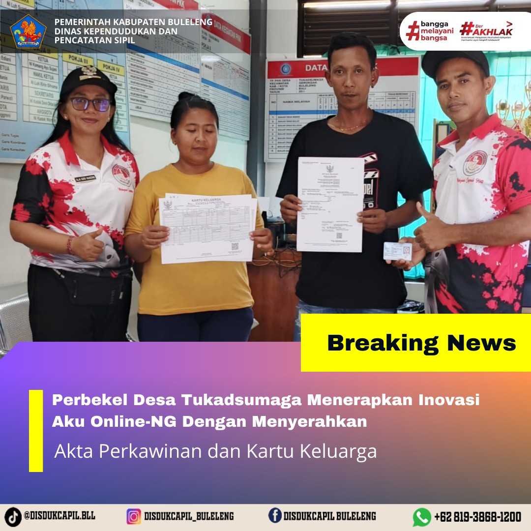 Pemerintah Kabupaten Buleleng melalui Dinas Kependudukan dan Pecatatan Sipil (Disdukcapil) Kabupaten Buleleng memaksimalkan serta mempermudah pelayanan kependudukan masyarakat dengan beberapa inovasi, melalui aplikasi AKU Online. Dimana dalam penerapan aplikasi Aku Online tersebut masyarakat tidak perlu lagi datang ke Dinas Dukcapil untuk melakukan pelayanan langsung cukup dengan datang ke Desa nanti akan dibantu oleh operator Desa masing-masing. Di Desa Tukadsumaga Kecamatan Gerokgak telah diserahkan dokumen kependudukan berupa Akta Perkawinan dan Kartu Keluarga atas nama I Gede Edi Apriana dengan Fitria warga Desa Tukadsumaga yang diserahkan secara langsung oleh Perbekel Desa Tukadsumaga Anak Agung Sri Wathi didampingi oleh Kelian Banjar Dinas Gandongan, Kecamatan Gerokgak, Jumat (19/9).