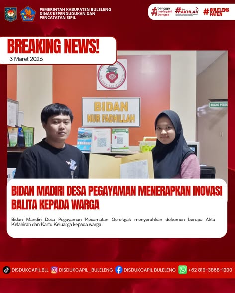 Pemerintah Kabupaten Buleleng melalui Dinas Kependudukan dan Pencatatan Sipil (Disdukcapil) Kabupaten Buleleng memaksimalkan serta mempermudah pelayanan kependudukan masyarakat dengan beberapa inovasi, yakni BALITA (Bayi Lahir Berakta), NYAKSI (Menyerahkan Akta Kawin Saat Acara Perkawinan) dan AKSAMA ( Akta Kematian Diserahkan Saat Masih Berduka) melalui aplikasi Aku Online-NG. Di Desa Pegayaman, Kecamatan Sukasada, telah diterapkan inovasi pelayanan BALITA (Bayi Lahir Berakta) dengan menyerahkan Akta Kelahiran dan Kartu Keluarga (KK) yang dilakukan secara langsung oleh Bidan Mandiri Nur Fadhillah kepada masyarakat yang baru memiliki bayi, Selasa (11/3).