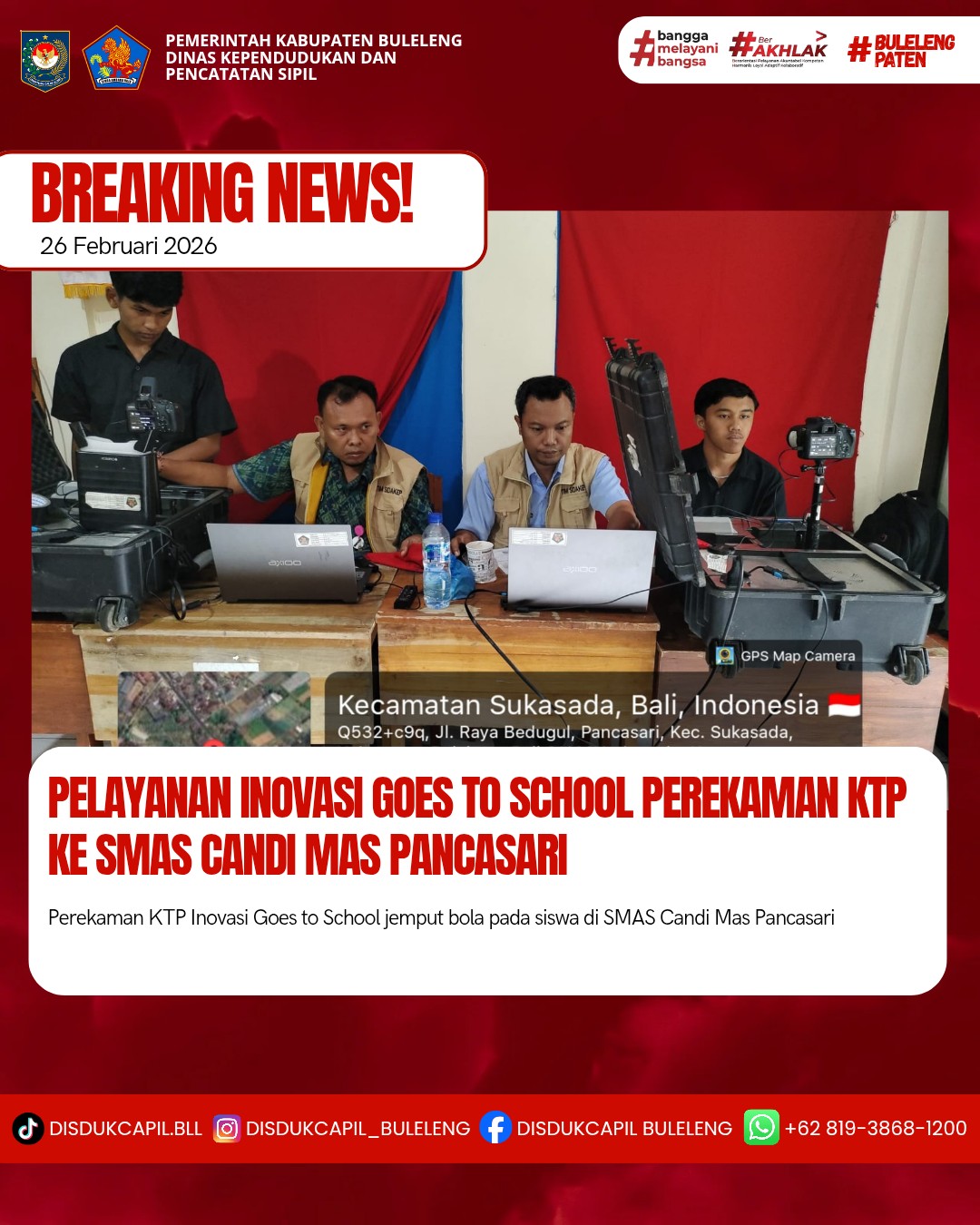 Pada kali ini Kamis, 26 Februari 2026 pelayanan perekaman KTP-el dilaksanakan di SMAS Candi Mas Pancasari. Hasil perekaman di SMAS Candi Mas Pancasari dengan data BNBA sebanyak 134 orang dan total yang melakukan perekaman sebanyak 82 orang, dimana hasil perekaman data di dalam BNBA sebanyak 73 orang dan data di luar BNBA sebanyak 9 orang yang melakukan perekaman. Dilihat dari hasil tersebut sisa data BNBA yang belum perekaman sebanyak 61 orang keterangan dari pihak sekolah Karena keterbatasan waktu siswa pulang jam 13.15, untuk sisa bnba sekolah minta untuk dijadwalkan ulang.