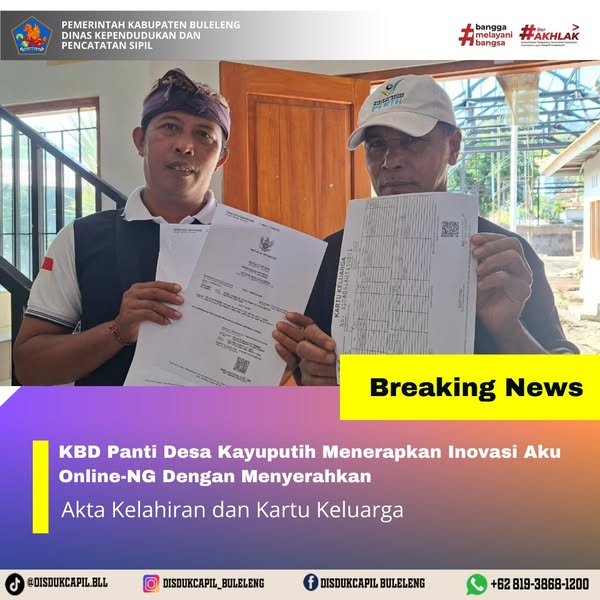Pemerintah Kabupaten Buleleng melalui Dinas Kependudukan dan Pecatatan Sipil (Disdukcapil) Kabupaten Buleleng memaksimalkan serta mempermudah pelayanan kependudukan masyarakat dengan beberapa inovasi, melalui aplikasi AKU Online-NG. Dimana dalam penerapan aplikasi Aku Online-NG tersebut masyarakat tidak perlu lagi datang ke Dinas Dukcapil untuk melakukan pelayanan langsung cukup dengan datang ke Desa nanti akan dibantu oleh operator Desa masing-masing. Di Desa Kayuputih Kecamatan Sukasada, telah diserahkan dokumen kependudukan berupa Akta Kelahiran atas nama Nyoman Madra dan Ketut Korti dan Kartu Keluarga atas nama Nyoman Madra yang diserahkan langsung oleh Kelian Banjar Dinas Panti Desa Kayuputih Kecamatan Sukasada bertempat di kantor Perbekel Desa Kayuputih, Kecamatan Sukasada, Kabupaten Buleleng, Rabu (17/9).