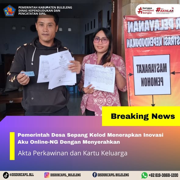 Pemerintah Kabupaten Buleleng melalui Dinas Kependudukan dan Pecatatan Sipil (Disdukcapil) Kabupaten Buleleng memaksimalkan serta mempermudah pelayanan kependudukan masyarakat dengan beberapa inovasi, melalui aplikasi AKU Online. Dimana dalam penerapan aplikasi Aku Online tersebut masyarakat tidak perlu lagi datang ke Dinas Dukcapil untuk melakukan pelayanan langsung cukup dengan datang ke Desa nanti akan dibantu oleh operator Desa masing-masing. Di Desa Sepang Kelod Kecamatan Busungbiu telah diserahkan dokumen kependudukan berupa Akta Perkawinan, KTP dan Kartu Keluarga yang diserahkan oleh Operator Desa, bertempat di Kantor Perbekel Desa Sepang Kelod, Kecamatan Busungbiu, Selasa (16/12).