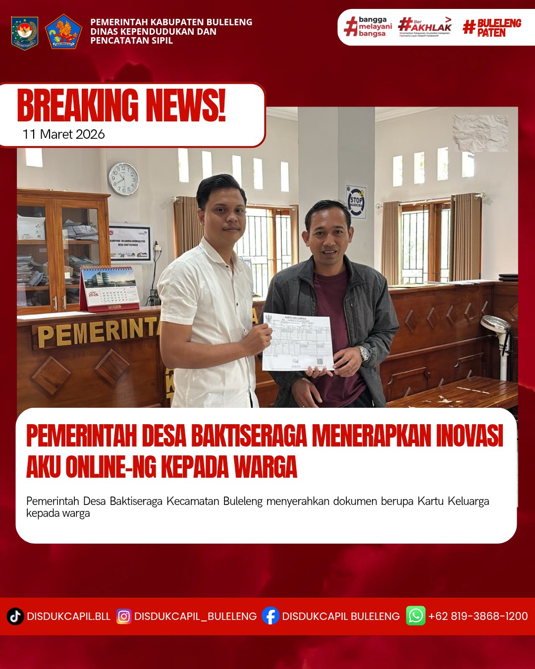 Pemerintah Kabupaten Buleleng melalui Dinas Kependudukan dan Pecatatan Sipil (Disdukcapil) Kabupaten Buleleng memaksimalkan serta mempermudah pelayanan kependudukan masyarakat dengan beberapa inovasi, melalui aplikasi AKU Online-NG. Dimana dalam penerapan aplikasi Aku Online-NG tersebut masyarakat tidak perlu lagi datang ke Dinas Dukcapil untuk melakukan pelayanan langsung cukup dengan datang ke Desa nanti akan dibantu oleh operator Desa masing-masing. Di Desa Baktiseraga Kecamatan Buleleng, telah diserahkan dokumen kependudukan berupa Kartu Keluarga yang diserahkan langsung oleh Kasi Pelayanan Desa Baktiseraga bertempat di kantor Perbekel Desa Baktiseraga, Kecamatan Buleleng, Kabupaten Buleleng, Rabu (11/3).