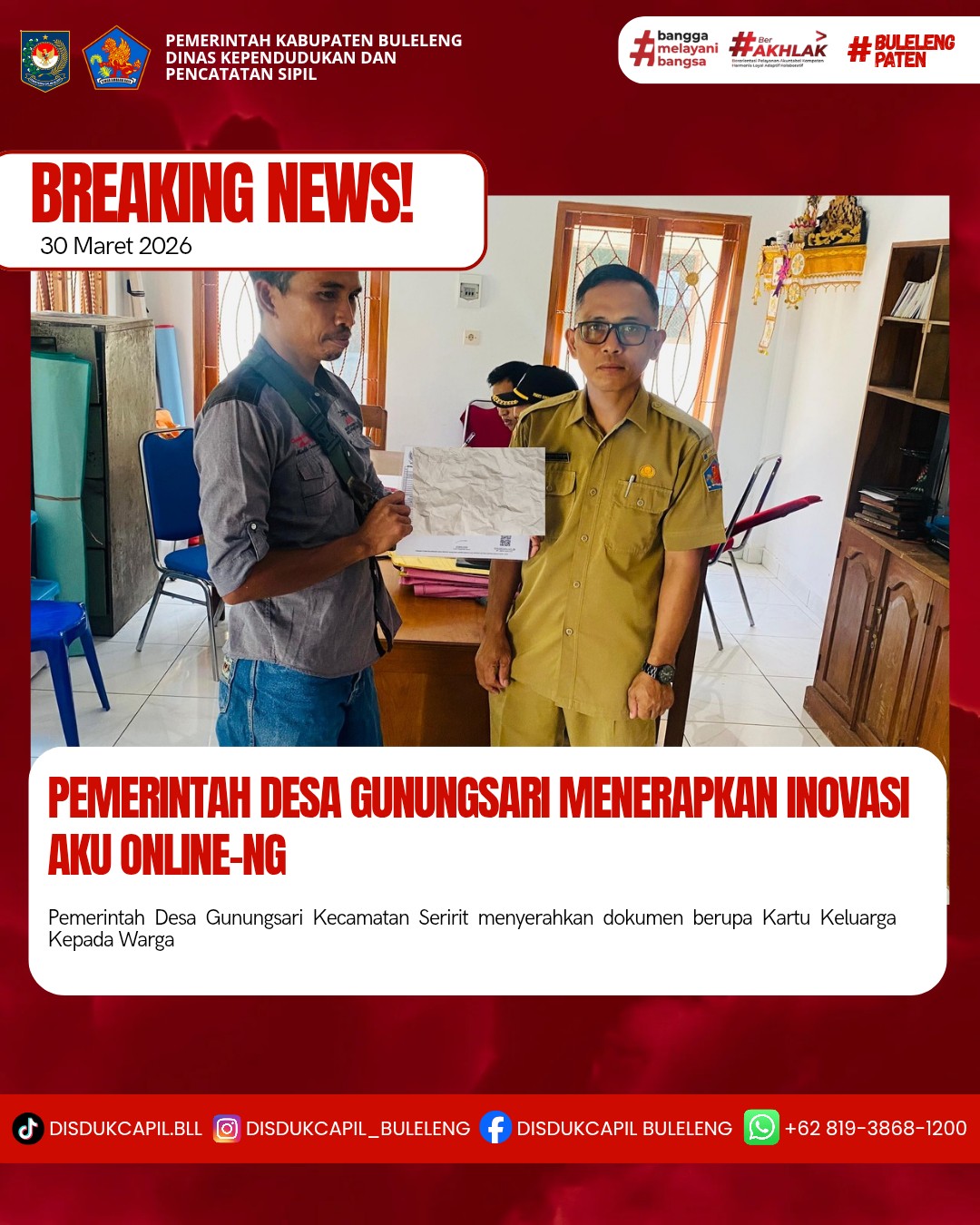 Pemerintah Kabupaten Buleleng melalui Dinas Kependudukan dan Pecatatan Sipil (Disdukcapil) Kabupaten Buleleng memaksimalkan serta mempermudah pelayanan kependudukan masyarakat dengan beberapa inovasi, melalui aplikasi AKU Online-NG. Dimana dalam penerapan aplikasi Aku Online-NG tersebut masyarakat tidak perlu lagi datang ke Dinas Dukcapil untuk melakukan pelayanan langsung, cukup dengan datang ke Desa nanti akan dibantu oleh operator Desa masing-masing. Di Desa Gunungsari Kecamatan Seririt, telah diserahkan dokumen kependudukan berupa Kartu Keluarga atas nama Nyoman Darma warga Banjar Dinas Sekar, Desa Gunungsari yang diserahkan oleh Pemerintah Desa Gunungsari kepada warga Banjar Dinas Sekar, bertempat di Kantor Perbekel Desa Gunungsari, Kecamatan Seririt, Kabupaten Buleleng, Senin (30/3).