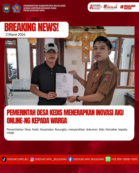 Pemerintah Kabupaten Buleleng melalui Dinas Kependudukan dan Pecatatan Sipil (Disdukcapil) Kabupaten Buleleng memaksimalkan serta mempermudah pelayanan kependudukan masyarakat dengan beberapa inovasi, melalui aplikasi AKU Online-NG. Dimana dalam penerapan aplikasi Aku Online-NG tersebut masyarakat tidak perlu lagi datang ke Dinas Dukcapil untuk melakukan pelayanan langsung cukup dengan datang ke Desa nanti akan dibantu oleh operator Desa masing-masing. Di Desa Kedis Kecamatan Busungbiu, telah diserahkan dokumen kependudukan berupa Akta Kematian warga Banjar Dinas Kelod, yang diserahkan langsung oleh Kasi Pemerintahan Desa Kedis Kadek Dita Yudistira, Senin (2/3).