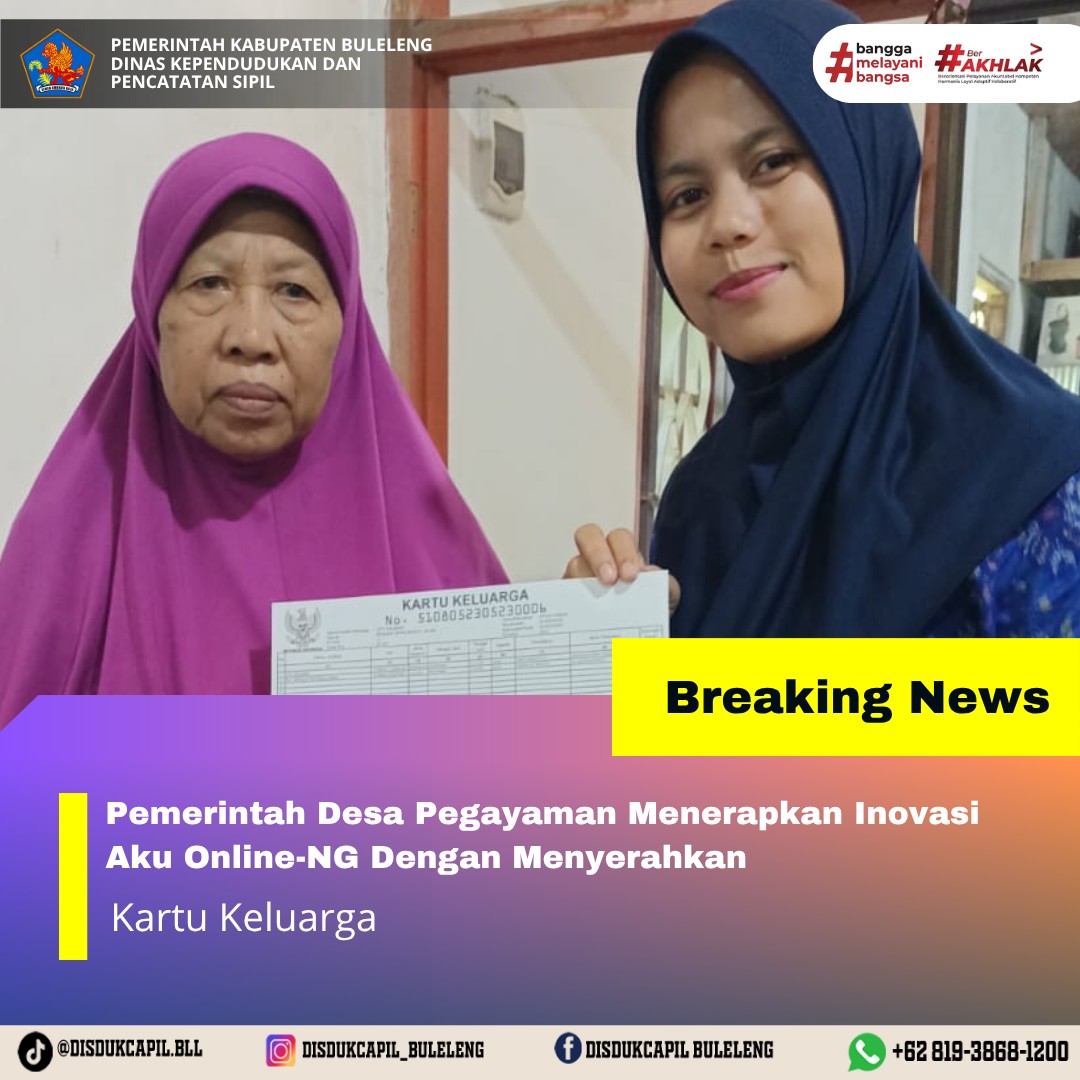 Pemerintah Kabupaten Buleleng melalui Dinas Kependudukan dan Pecatatan Sipil (Disdukcapil) Kabupaten Buleleng memaksimalkan serta mempermudah pelayanan kependudukan masyarakat dengan beberapa inovasi, melalui aplikasi AKU Online-NG. Dimana dalam penerapan aplikasi Aku Online-NG tersebut masyarakat tidak perlu lagi datang ke Dinas Dukcapil untuk melakukan pelayanan langsung cukup dengan datang ke Desa nanti akan dibantu oleh operator Desa masing-masing. Di Desa Pegayaman Kecamatan Sukasada, telah diserahkan dokumen kependudukan berupa Kartu Keluarga karena rusak kepada warga atas nama SITI HALIMAH yang beralamat di Banjar Dinas Barat Jalan Desa Pegayaman yang diserahkan langsung oleh Kasi Pemerintahan Desa Pegayaman, Selasa (14/10).
