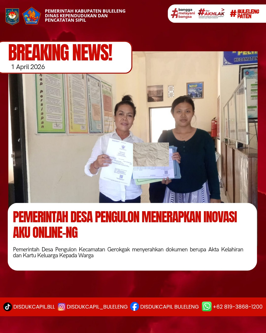 Pemerintah Kabupaten Buleleng melalui Dinas Kependudukan dan Pecatatan Sipil (Disdukcapil) Kabupaten Buleleng memaksimalkan serta mempermudah pelayanan kependudukan masyarakat dengan beberapa inovasi, melalui aplikasi AKU Online-NG. Dimana dalam penerapan aplikasi Aku Online-NG tersebut masyarakat tidak perlu lagi datang ke Dinas Dukcapil untuk melakukan pelayanan langsung cukup dengan datang ke Desa nanti akan dibantu oleh operator Desa masing-masing. Di Desa Pengulon Kecamatan Gerokgak, telah diserahkan dokumen kependudukan berupa Akta Kelahiran dan Kartu Keluarga atas nama Kadek Suparma Yasa yang diserahkan secara langsung oleh Kasi Pelayanan Desa Pengulon Kecamatan Gerokgak, Rabu (1/4).