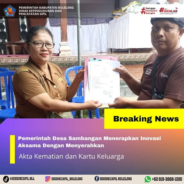 Pemerintah Kabupaten Buleleng melalui Dinas Kependudukan dan Pecatatan Sipil (Disdukcapil) Kabupaten Buleleng memaksimalkan serta mempermudah pelayanan kependudukan masyarakat dengan beberapa inovasi, yakni BALITA (Bayi Lahir Berakta), NYAKSI (Menyerahkan Akta Kawin Saat Acara Perkawinan) dan AKSAMA ( Akta Kematian Diserahkan Saat Masih Berduka) melalui aplikasi Aku Online-NG. Di Desa Sambangan Kecamatan Sukasada, telah diterapkan program Aksama (Akta Kematian Diserahkan Saat Masih Berduka) yang dilakukan secara langsung oleh Kasi Pemerintahan Desa Sambangan dengan menyerahkan Akta Kematian atas nama I Gusti Putu Renes dan Kartu Keluarga atas nama I Gusti Ngurah Alit Sanjaya kepada pihak keluarga di rumah duka di Desa Sambangan, Senin (15/12).