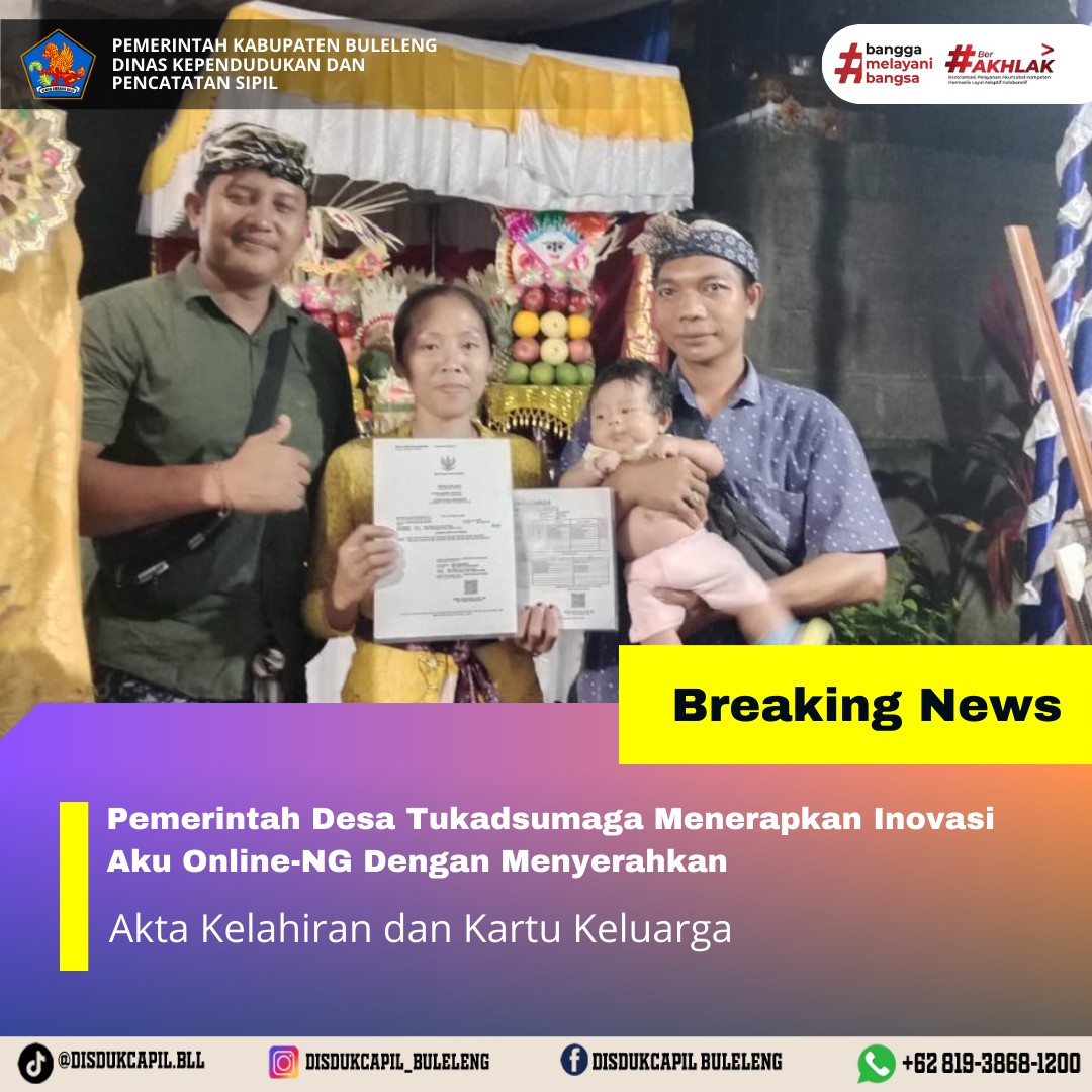 Pemerintah Kabupaten Buleleng melalui Dinas Kependudukan dan Pecatatan Sipil (Disdukcapil) Kabupaten Buleleng memaksimalkan serta mempermudah pelayanan kependudukan masyarakat dengan beberapa inovasi, melalui aplikasi AKU Online-NG. Dimana dalam penerapan aplikasi Aku Online-NG tersebut masyarakat tidak perlu lagi datang ke Dinas Dukcapil untuk melakukan pelayanan langsung cukup dengan datang ke Desa nanti akan dibantu oleh operator Desa masing-masing. Di Desa Tukadsumaga Kecamatan Gerokgak, telah diserahkan dokumen kependudukan berupa Akta Kelahiran atas nama I KOMANG SURYA ADIWIGUNA dan Kartu Keluarga atas nama I KOMANG PARTIKA yang diserahkan oleh Pemerintah Desa Tukadsumaga, Jumat (19/12).