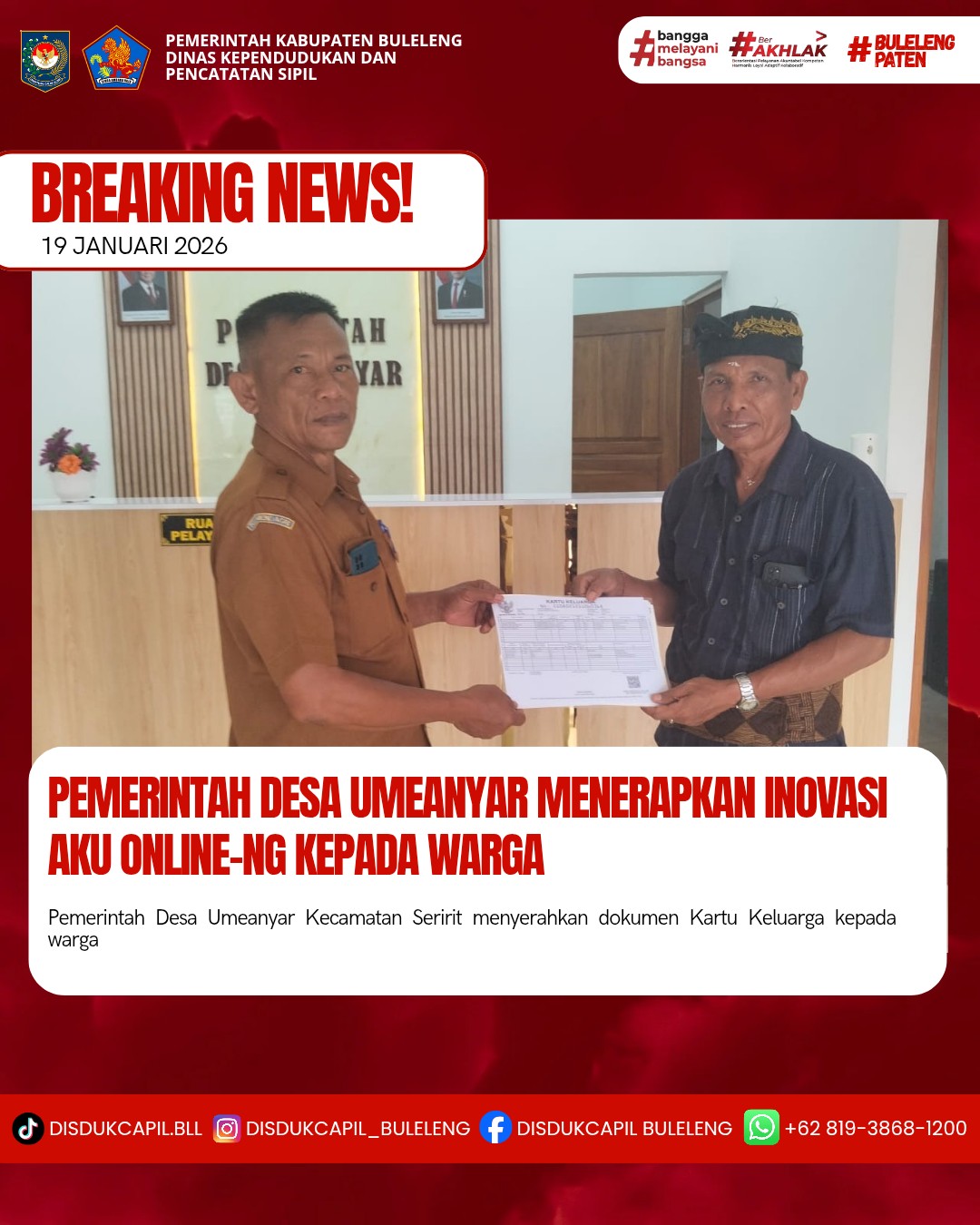 Pemerintah Kabupaten Buleleng melalui Dinas Kependudukan dan Pecatatan Sipil (Disdukcapil) Kabupaten Buleleng memaksimalkan serta mempermudah pelayanan kependudukan masyarakat dengan beberapa inovasi, melalui aplikasi AKU Online-NG. Dimana dalam penerapan aplikasi Aku Online-NG tersebut masyarakat tidak perlu lagi datang ke Dinas Dukcapil untuk melakukan pelayanan langsung cukup dengan datang ke Desa nanti akan dibantu oleh operator Desa masing-masing. Di Desa Umeanyar Kecamatan Seririt telah diserahkan dokumen kependudukan berupa Kartu Keluarga atas nama I Ketut Budiarsa yang diserahkan secara langsung oleh Kelian Banjar Dinas Kundalini Desa Umeanyar Kecamatan Seririt, Senin (19/1).