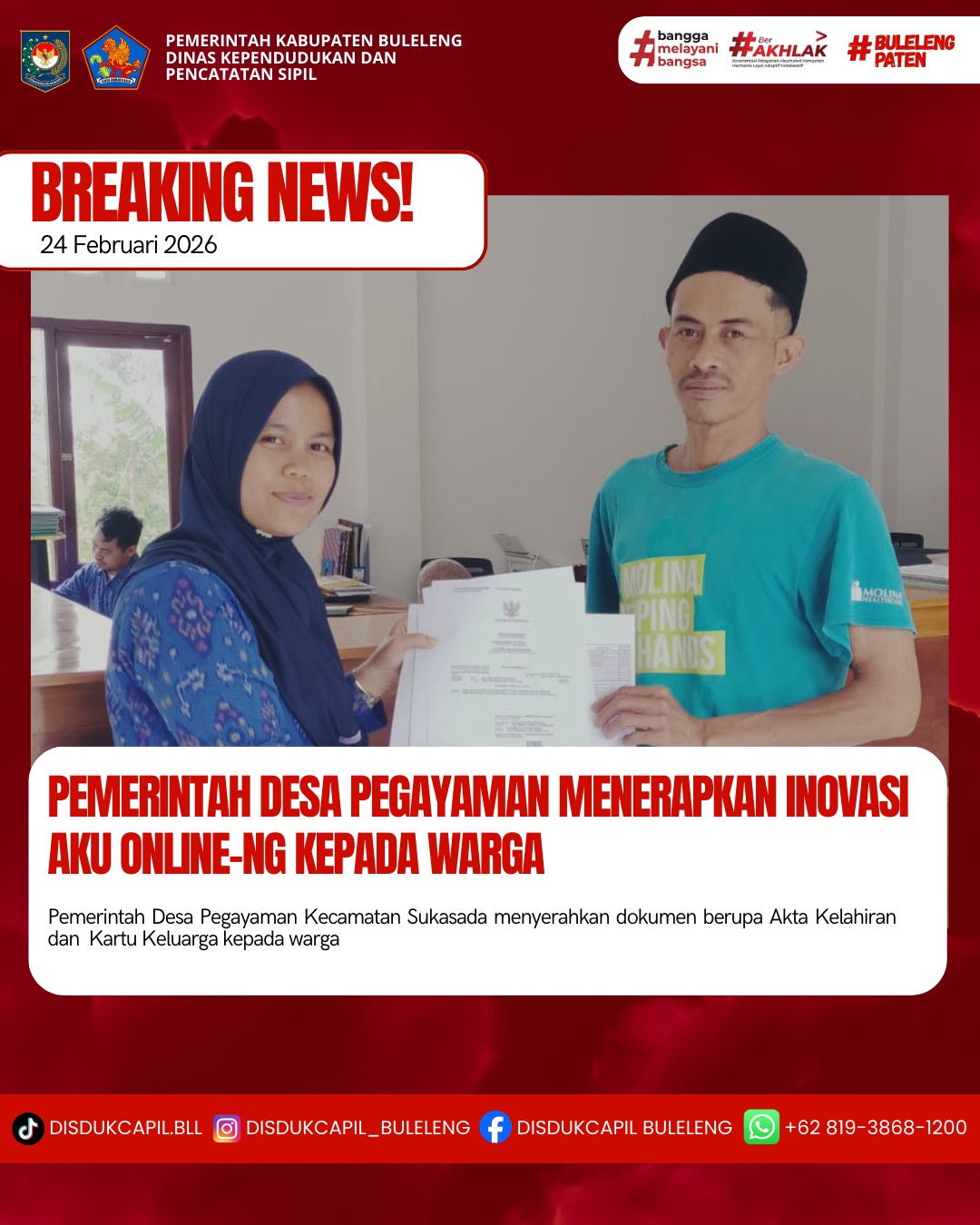 Pemerintah Kabupaten Buleleng melalui Dinas Kependudukan dan Pecatatan Sipil (Disdukcapil) Kabupaten Buleleng memaksimalkan serta mempermudah pelayanan kependudukan masyarakat dengan beberapa inovasi, melalui aplikasi AKU Online-NG. Dimana dalam penerapan aplikasi Aku Online-NG tersebut masyarakat tidak perlu lagi datang ke Dinas Dukcapil untuk melakukan pelayanan langsung cukup dengan datang ke Desa nanti akan dibantu oleh operator Desa masing-masing. Di Desa Pegayaman Kecamatan Sukasada, telah diserahkan dokumen kependudukan berupa Akta Kelahiran anaknya dan Kartu Keluarga kepada warga atas nama Muhammad Itqam Tamtami kepada warga yang beralamat di Banjar Dinas Barat Jalan Desa Pegayaman yang diserahkan langsung oleh Kasi Pemerintahan Desa Pegayaman, Selasa (24/2).