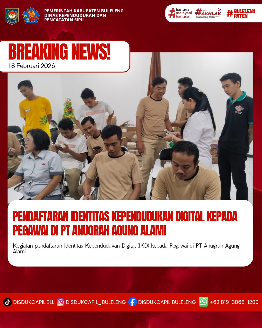 Menerapkan aturan pemerintah tersebut, Dinas Kependudukan dan Pencatatan Sipil Kabupaten Buleleng menyelenggarakan Pendaftaran Identitas Kependudukan Digital ke sekolah-sekolah, Dinas, Lembaga dan Perusahaan secara bergilir setiap harinya. Kali ini pelaksanaan pendaftaran Identitas Kependudukan Digital kepada Pegawai yang dilaksanakan di PT. Anugrah Agung Alami (Wings), Rabu (18/2).