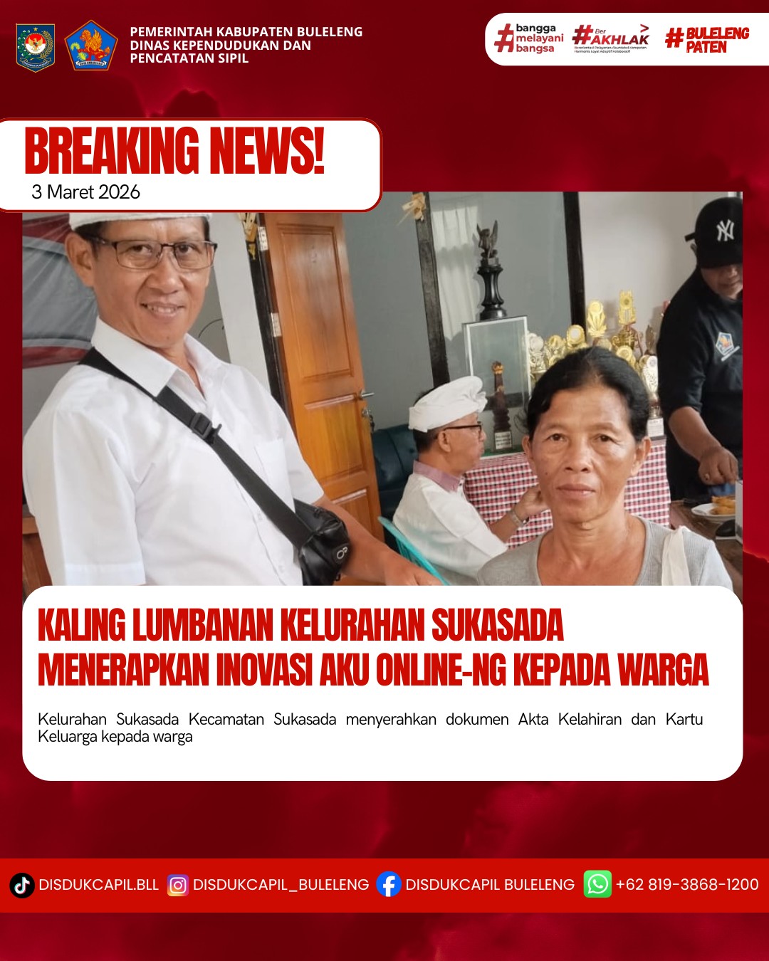Pemerintah Kabupaten Buleleng melalui Dinas Kependudukan dan Pecatatan Sipil (Disdukcapil) Kabupaten Buleleng memaksimalkan serta mempermudah pelayanan kependudukan masyarakat dengan beberapa inovasi, melalui aplikasi AKU Online-NG. Dimana dalam penerapan aplikasi Aku Online-NG tersebut masyarakat tidak perlu lagi datang ke Dinas Dukcapil untuk melakukan pelayanan langsung cukup dengan datang ke Desa nanti akan dibantu oleh operator Desa masing-masing. Di Kelurahan Sukasada Kecamatan Sukasada, telah diserahkan dokumen kependudukan berupa Akta Kelahiran dan Kartu Keluarga atas nama Gede Sadia warga Lingkungan Lumbanan, Kelurahan Sukasada yang diserahkan langsung oleh Kepala Lingkungan Lumbanan Kelurahan Sukasada Kecamatan Sukasada, Kabupaten Buleleng, Selasa (3/3).