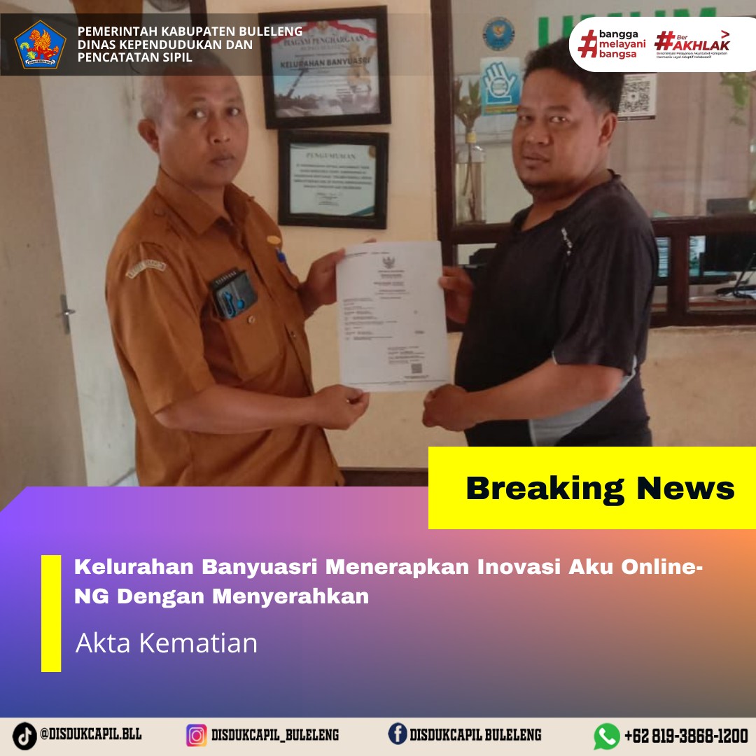 Pemerintah Kabupaten Buleleng melalui Dinas Kependudukan dan Pecatatan Sipil (Disdukcapil) Kabupaten Buleleng memaksimalkan serta mempermudah pelayanan kependudukan masyarakat dengan beberapa inovasi, melalui aplikasi AKU Online-NG. Dimana dalam penerapan aplikasi Aku Online-NG tersebut masyarakat tidak perlu lagi datang ke Dinas Dukcapil untuk melakukan pelayanan langsung cukup dengan datang ke Desa nanti akan dibantu oleh operator Desa masing-masing. Di Kelurahan Banyuasri Kecamatan Buleleng, telah diserahkan dokumen kependudukan berupa Akta Kematian atas nama Luh Sutarmi yang diserahkan langsung oleh Kaling Kelurahan Banyuasri, Kecamatan Buleleng, Kabupaten Buleleng, Senin (15/12).