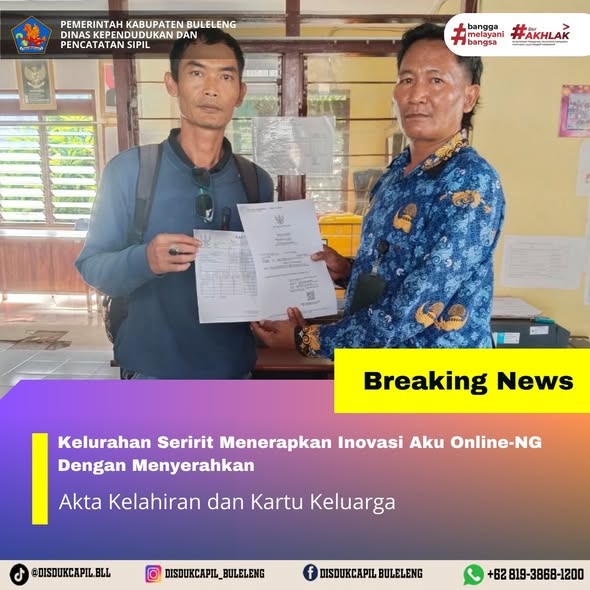 Pemerintah Kabupaten Buleleng melalui Dinas Kependudukan dan Pecatatan Sipil (Disdukcapil) Kabupaten Buleleng memaksimalkan serta mempermudah pelayanan kependudukan masyarakat dengan beberapa inovasi, melalui aplikasi AKU Online-NG. Dimana dalam penerapan aplikasi Aku Online-NG tersebut masyarakat tidak perlu lagi datang ke Dinas Dukcapil untuk melakukan pelayanan langsung cukup dengan datang ke Desa nanti akan dibantu oleh operator Desa masing-masing. Di Kelurahan Seririt Kecamatan Seririt, telah diserahkan dokumen kependudukan berupa Akta Kelahiran dan Kartu Keluarga atas nama Komang Agung Kertarahaja yang diserahkan langsung oleh Operator Kelurahan Seririt Kecamatan Seririt, Kabupaten Buleleng, Rabu (17/12).