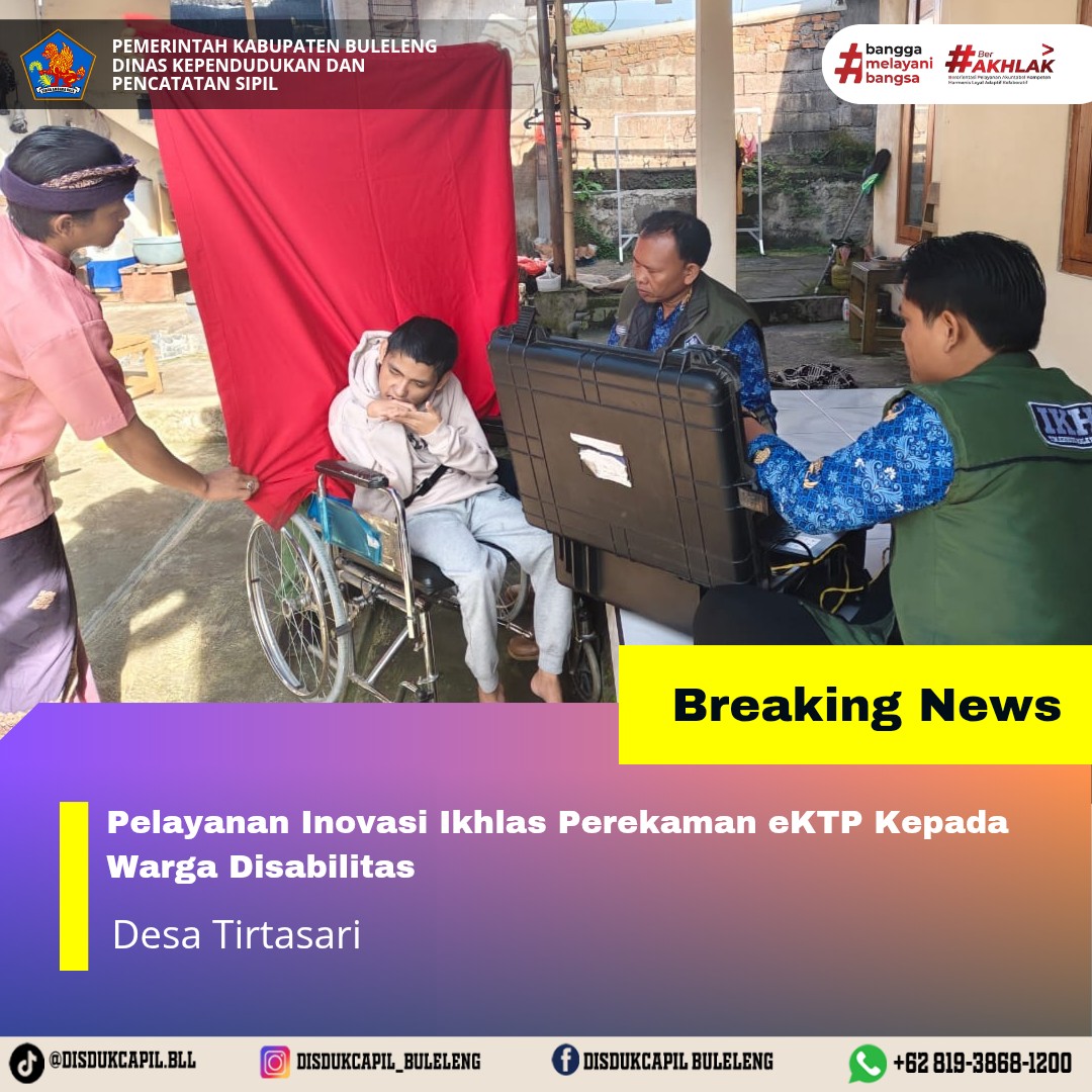 Dinas Kependudukan dan Pencatatan Sipil Kabupaten Buleleng terus berupaya memberikan pelayanan maksimal pada masyarakat dalam rangka meningkatkan kesadaran kepada masyarakat akan pentingnya memiliki dokumen kependudukan salah satunya Kartu Tanda Penduduk (KTP). Berbagai macam inovasi dikembangkan untuk mempermudah masyarakat dapat memiliki dokumen kependudukan. Salah satu Inovasi yang diberikan kepada masyarakat adalah Inovasi "IKHLAS" (Tim Khusus Layanan Untuk Orang Sakit dan Disabilitas) yaitu jembut bola perekaman KTP-el ke rumah warga yang tidak bisa datang langsung ke Kantor Disdukcapil untuk melakukan perekaman eKTP. Sesuai dengan Undang-Undang Republik Indonesia Nomor 24 Tahun 2013 tentang Administrasi Kependudukan, menyatakan bahwa Penduduk Warga Negara Indonesia dan Orang Asing yang memiliki Izin Tinggal Tetap yang telah berumur 17 (tujuh belas) tahun atau telah kawin atau pernah kawin wajib memiliki KTP-el. Namun demikian, ada beberapa penduduk yang tidak bisa datang langsung ke Kantor Dinas Kependudukan dan Pencatatan Sipil Kabupaten Buleleng karena kendala kesehatan dan usia lanjut.