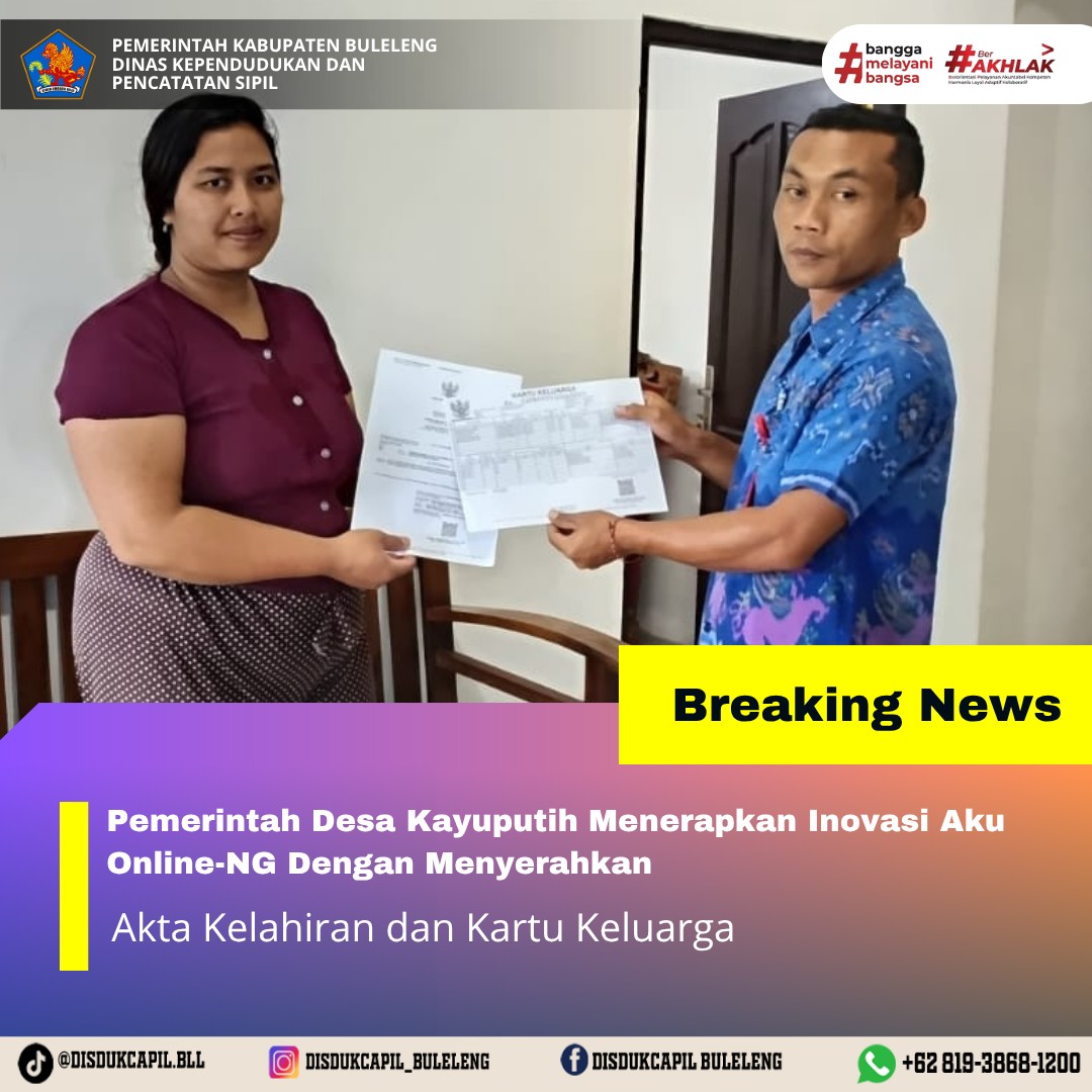 Pemerintah Kabupaten Buleleng melalui Dinas Kependudukan dan Pecatatan Sipil (Disdukcapil) Kabupaten Buleleng memaksimalkan serta mempermudah pelayanan kependudukan masyarakat dengan beberapa inovasi, melalui aplikasi AKU Online-NG. Dimana dalam penerapan aplikasi Aku Online-NG tersebut masyarakat tidak perlu lagi datang ke Dinas Dukcapil untuk melakukan pelayanan langsung cukup dengan datang ke Desa nanti akan dibantu oleh operator Desa masing-masing. Di Desa Kayuputih Kecamatan Banjar, telah diserahkan dokumen kependudukan berupa Akta Kelahiran atas nama Putu Mita Suariani dan Kartu Keluarga yang diserahkan secara langsung oleh Pemerintah Desa Kayuputih Kecamatan Banjar, Selasa (28/10).