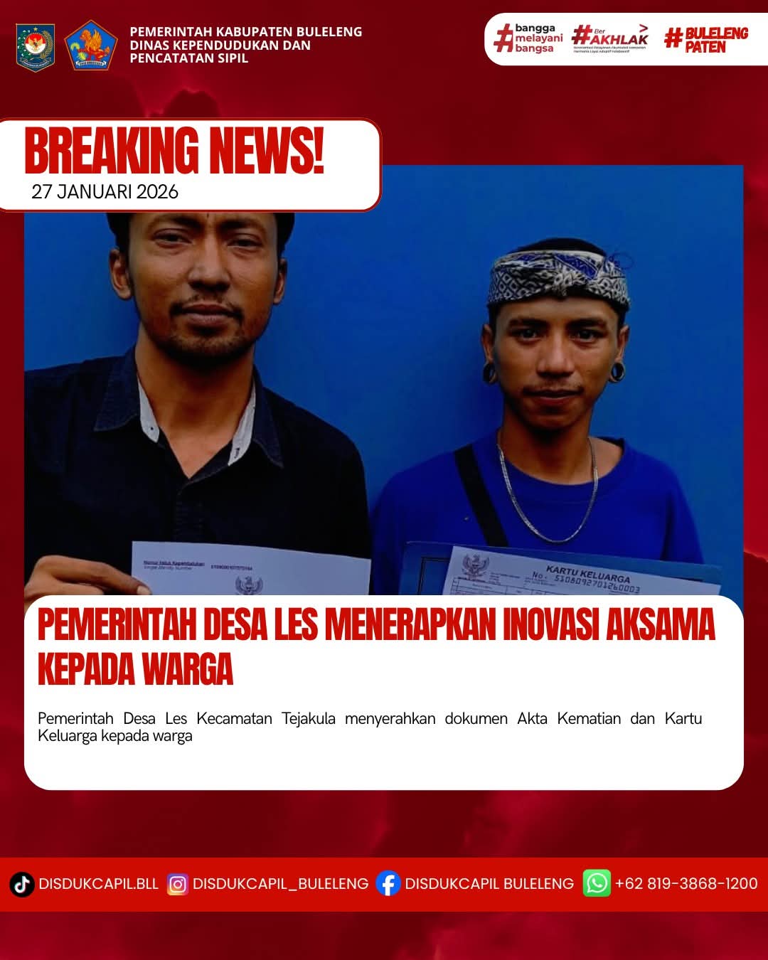 Pemerintah Kabupaten Buleleng melalui Dinas Kependudukan dan Pecatatan Sipil (Disdukcapil) Kabupaten Buleleng memaksimalkan serta mempermudah pelayanan kependudukan masyarakat dengan beberapa inovasi, yakni BALITA (Bayi Lahir Berakta), NYAKSI (Menyerahkan Akta Kawin Saat Acara Perkawinan) dan AKSAMA ( Akta Kematian Diserahkan Saat Masih Berduka) melalui aplikasi Aku Online-NG. Di Desa Les Kecamatan Tejakula, telah diterapkan program Aksama (Akta Kematian Diserahkan Saat Masih Berduka) yang dilakukan secara langsung oleh Kelian Banjar Dinas Butiyang Desa Les dengan menyerahkan Akta Kematian dan Kartu Keluarga kepada keluarga almarhum di Banjar Dinas Kawanan, Desa Les, Selasa (27/1).